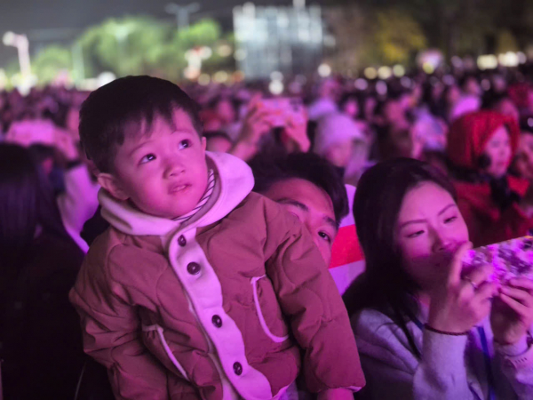 Bé trai thích thú khi được cùng bố mẹ tham dự Chương trình khai mạc Lễ hội Hoa đào Xứ Lạng 2026 và chiêm ngưỡng màn pháo hoa đặc sắc tại Lễ hội.