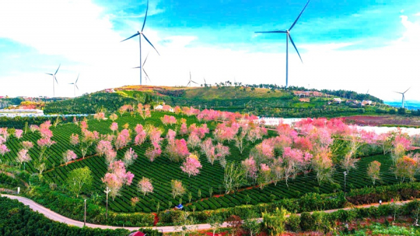 Quanh những triền đồi thoai thoải, mai anh đào bung nở thành từng hàng. Sắc hồng tươi tắn nổi bật trên nền trời xanh thẳm và những rặng thông trầm mặc, tạo nên khung cảnh choáng ngợp, lung linh sắc màu.