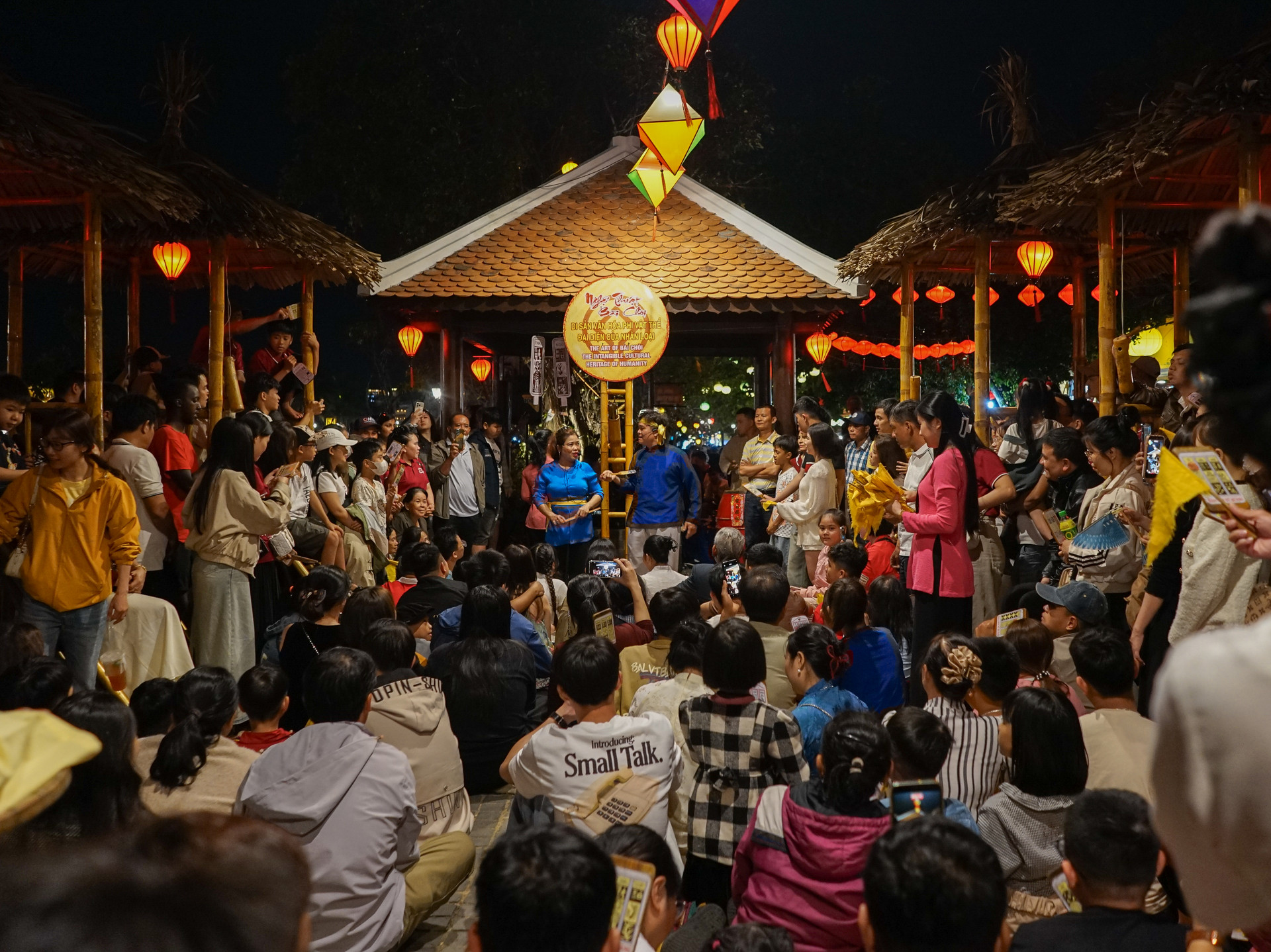 Hoạt động hô hát bài chòi diễn ra hằng đêm bên sông Hoài thu hút nhiều du khách. Ảnh: XUÂN SƠN