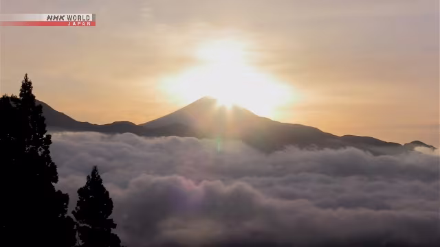 Mặt trời ở ngay đỉnh núi Phú Sĩ tạo ra khung cảnh như thể viên kim cương đang tỏa sáng lấp lánh