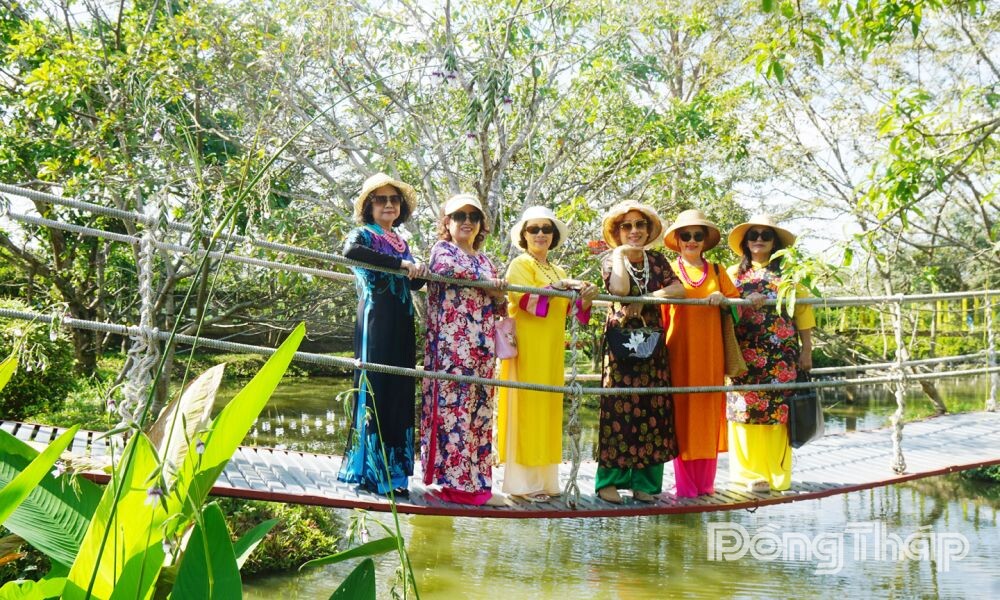 Nhóm du khách trong áo dài đa sắc màu lưu giữ kỷ niệm tại tiểu cảnh cầu treo giữa Làng hoa Sa Đéc.