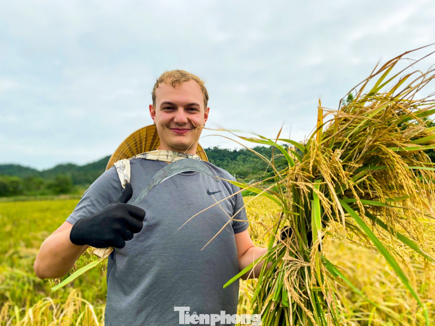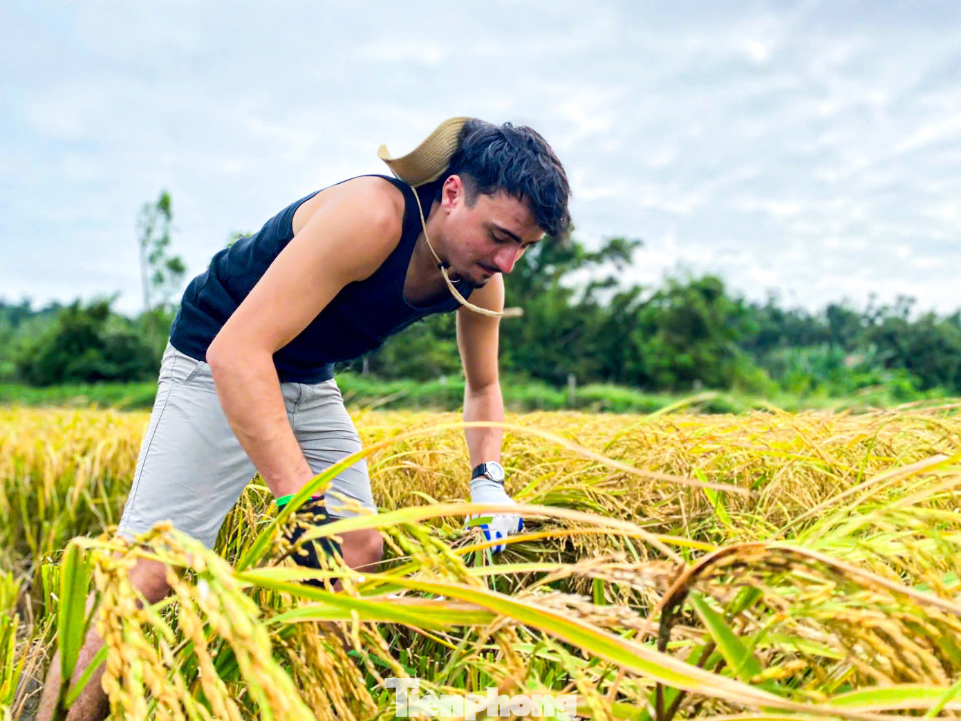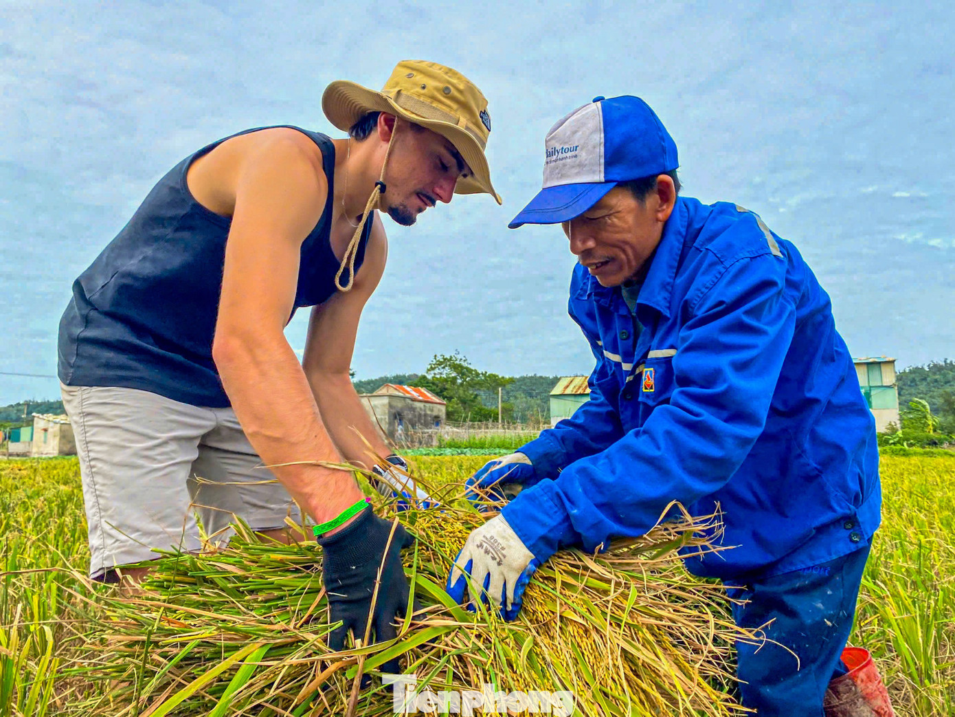 Buổi sáng, trên cánh đồng rộng bát ngát thuộc thôn Hải Tiến, Đặc khu Cô Tô, cả hai anh Tây được người dân địa phương hướng dẫn cách dùng liềm gặt lúa và tỏ ra thú vị với trải nghiệm này. Bà Bùi Thị Phượng - người dân thôn Hải Tiến - chia sẻ: “Thấy các bạn nước ngoài xuống ruộng gặt, tôi vừa ngạc nhiên vừa vui. Họ vụng về nhưng rất chăm chỉ, còn hỏi han cách làm sao cho đúng. Nhìn họ rất hào hứng khi được trải nghiệm làm nông dân”.