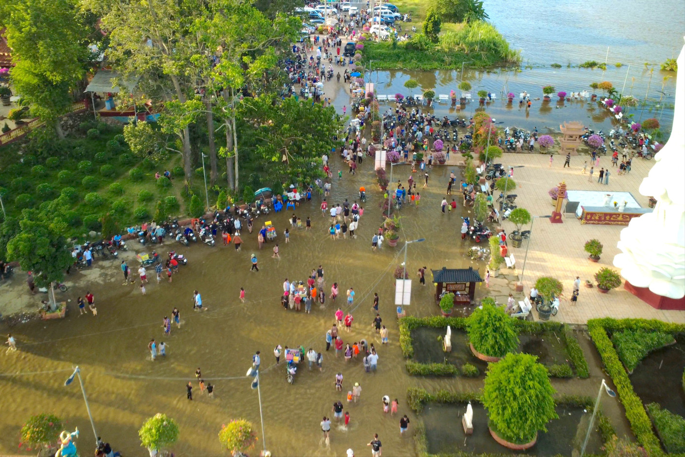 “Lần đầu tôi thấy chùa ngập như thế này, ngồi ăn giữa nước cảm giác rất lạ, vừa vui vừa thư giãn”, chị Nguyễn Cẩm Hồng (35 tuổi, TP. Cần Thơ) chia sẻ.