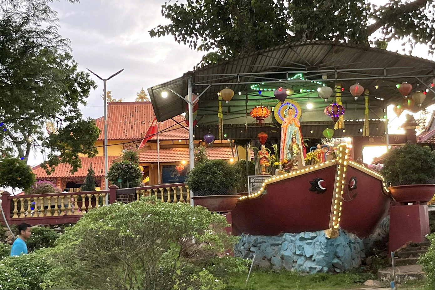 Mô hình chiếc thuyền mắc lại trên bệ đá được dựng lại trước chùa Núi Nổi.