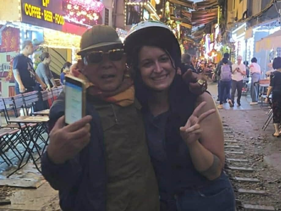 Clarissa và tài xế chụp ảnh ở phố đường tàu. Ảnh: NVCC