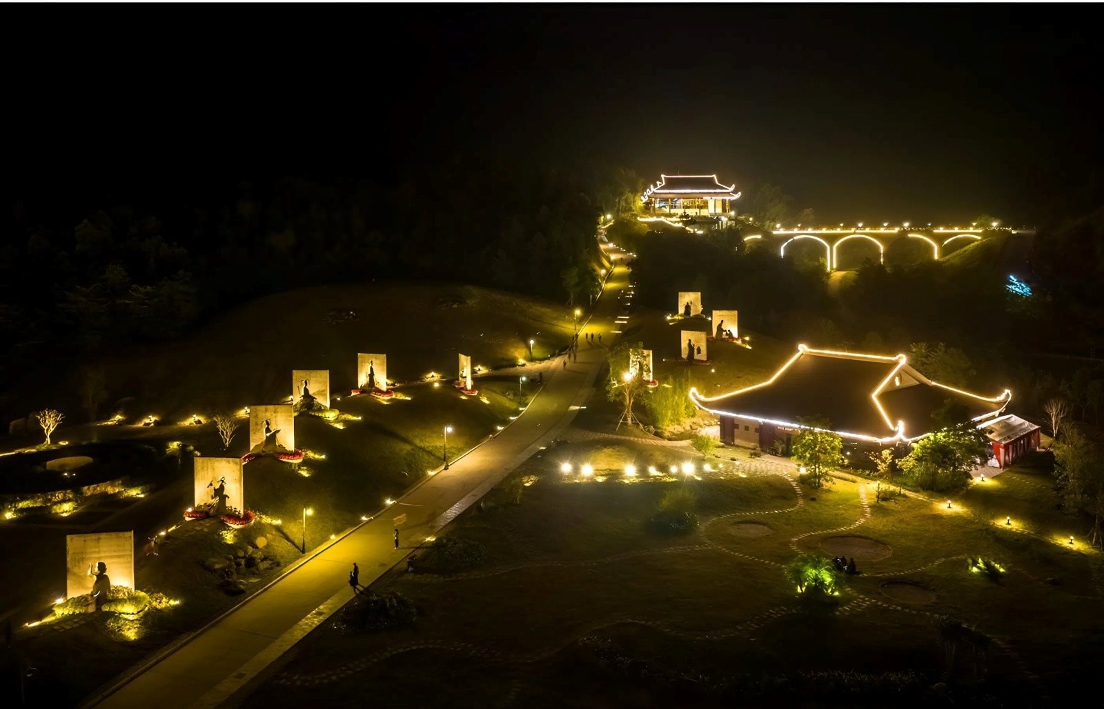 Tại khu vực Hoa Nghiêm bảo tháp, công trình nổi bật nằm giữa hồ nước, nhiều du khách dừng chân thắp hương và chụp ảnh lưu niệm. Tiếng chuông chùa vang lên giữa thung lũng, lan tỏa trong không gian núi rừng tĩnh lặng, mang lại cảm giác an yên cho người hành hương.