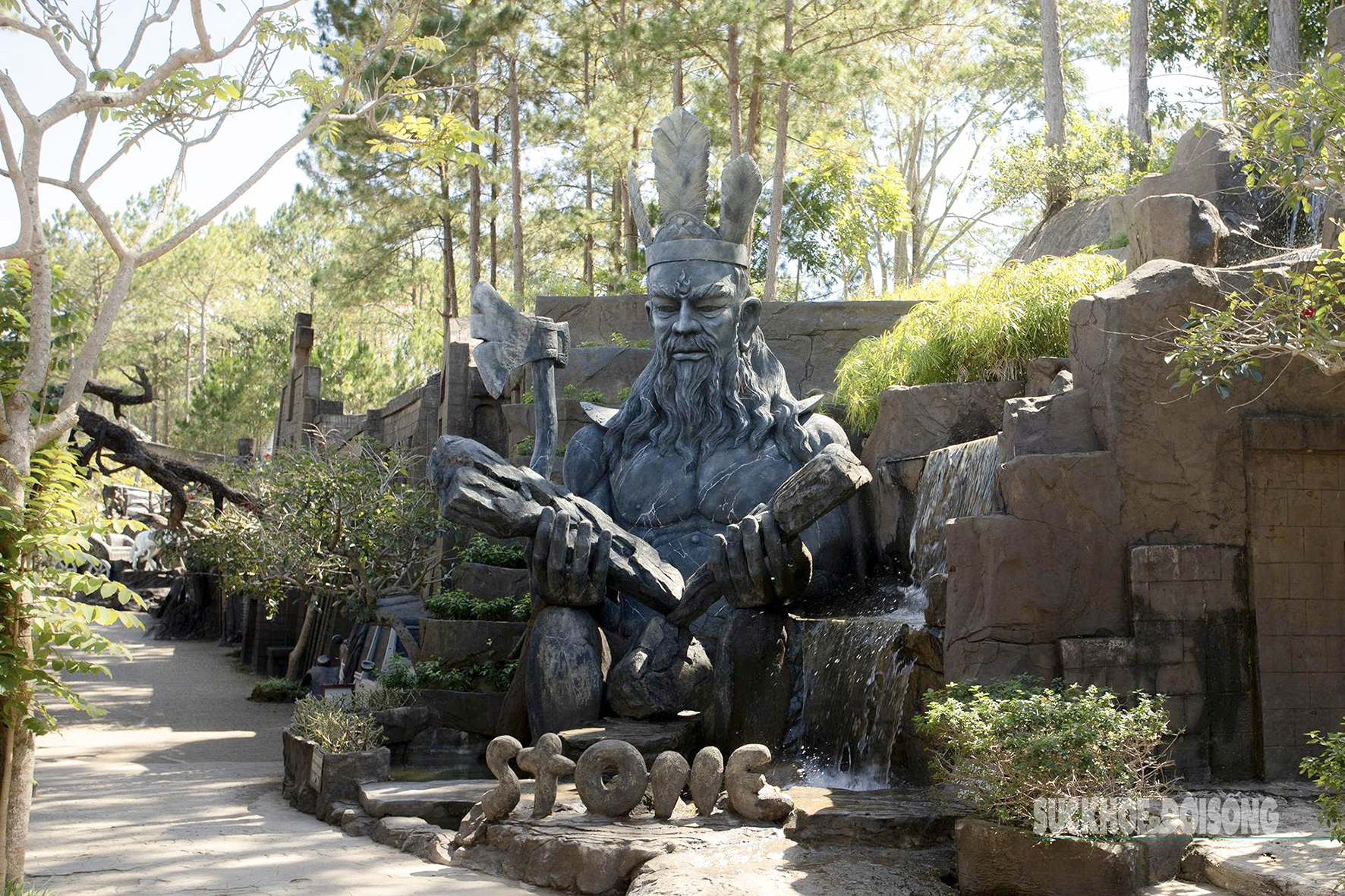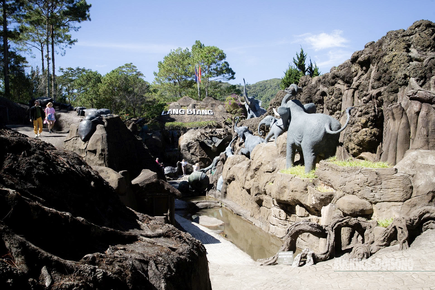 Khu tiểu cảnh gợi nhắc Langbiang với mảng chữ nổi và hệ tượng trang trí.