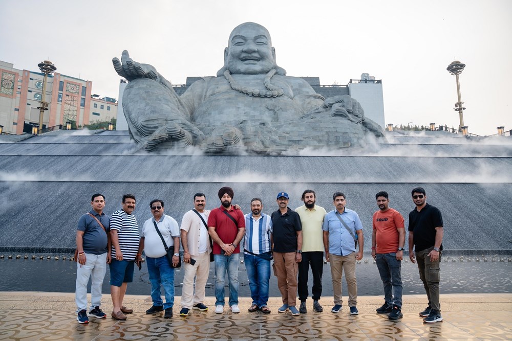 Đoàn du khách Ấn Độ chụp ảnh kỷ niệm dưới chân Tượng Bồ Tát Di Lặc