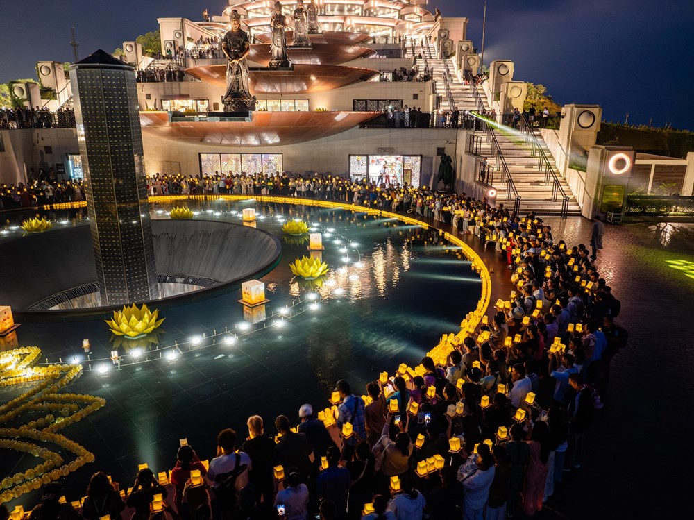 Tại quảng trường trung tâm, hình ảnh đoàn người cùng trang nghiêm, tay nâng niu những ngọn đèn đăng tỏa sáng rực rỡ tạo nên một biển ánh sáng hùng vĩ giữa mây ngàn.