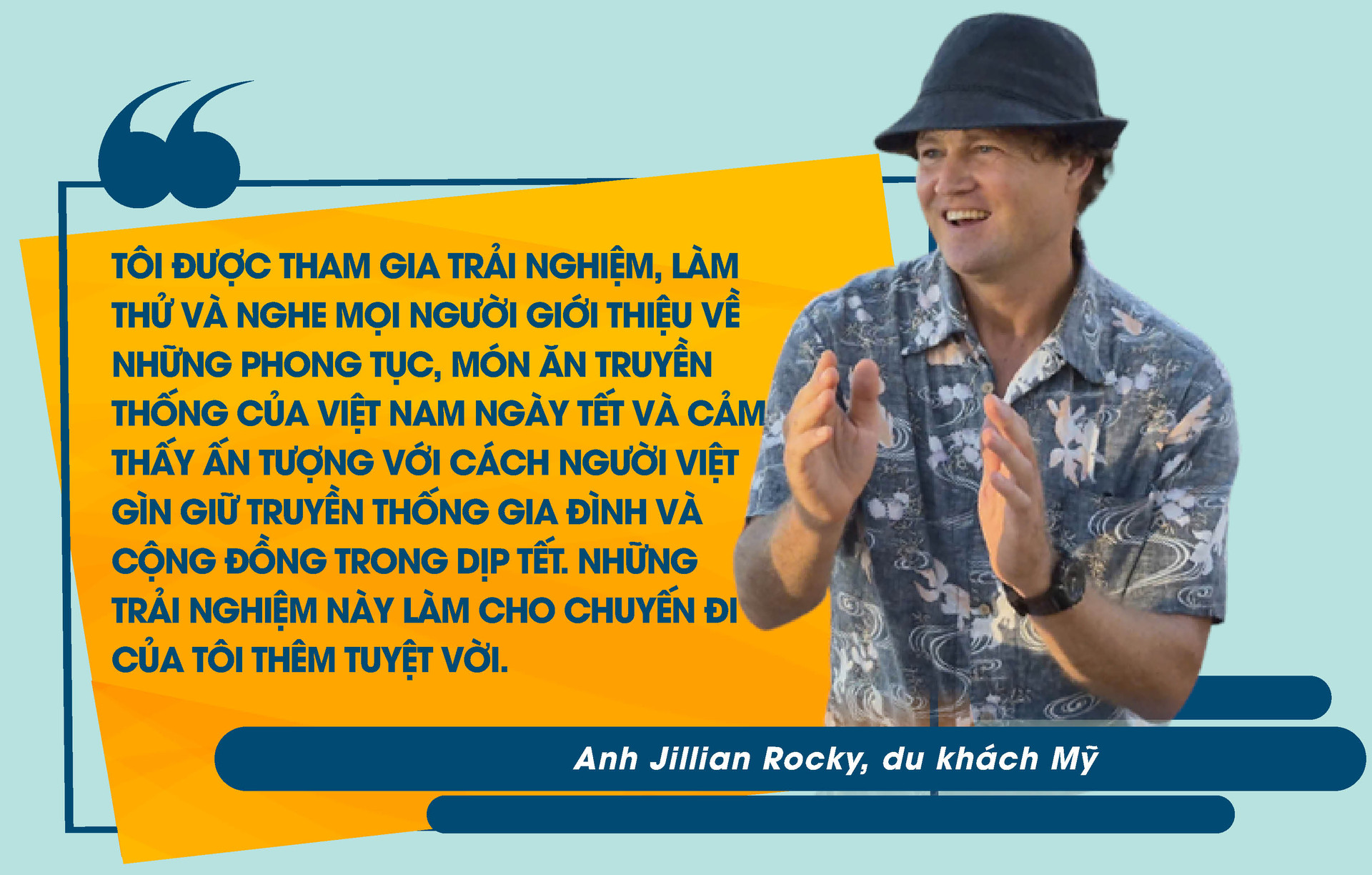 Ban đầu, anh Jillian Rocky (du khách Mỹ) chỉ có ý định đi dạo trên bãi biển Mỹ Khê nhưng khi thấy không gian Tết quá thú vị, anh đã không ngần ngại trải nghiệm trải nghiệm cùng xếp lá, xếp đậu, thịt gói bánh chưng và thưởng thức mứt gừng, mứt dừa.
