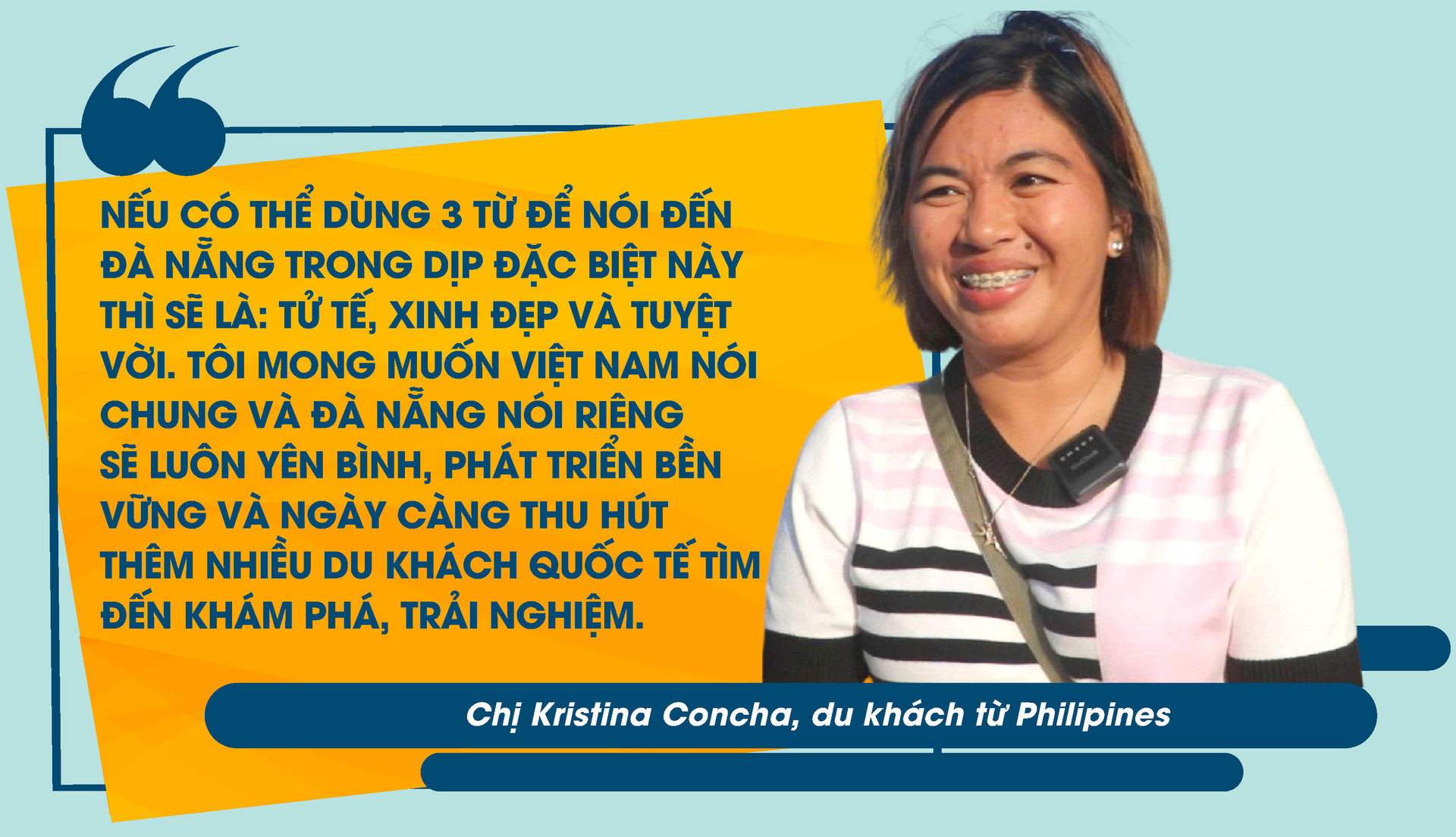 Lần đầu tiên cùng gia đình đến và đón Tết Nguyên đán tại Việt Nam, chị Kristina Concha, du khách từ Philipines cũng bày tỏ ấn tượng sâu sắc trước không khí Tết Nguyên đán tại Đà Nẵng. Sự rực rỡ của sắc hoa hiện diện khắp các tuyến phố để lại trong chị nhiều cảm xúc đặc biệt, mang đến cảm giác mới mẻ so với những gì chị từng thấy tại Philipines.