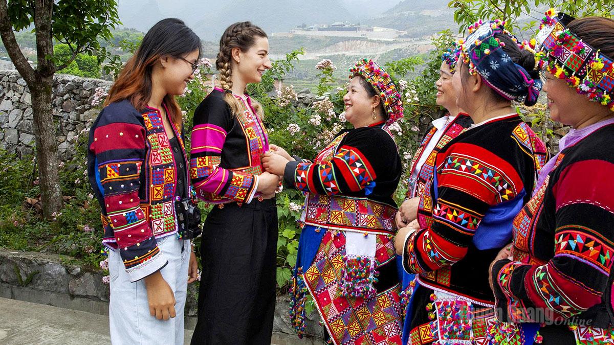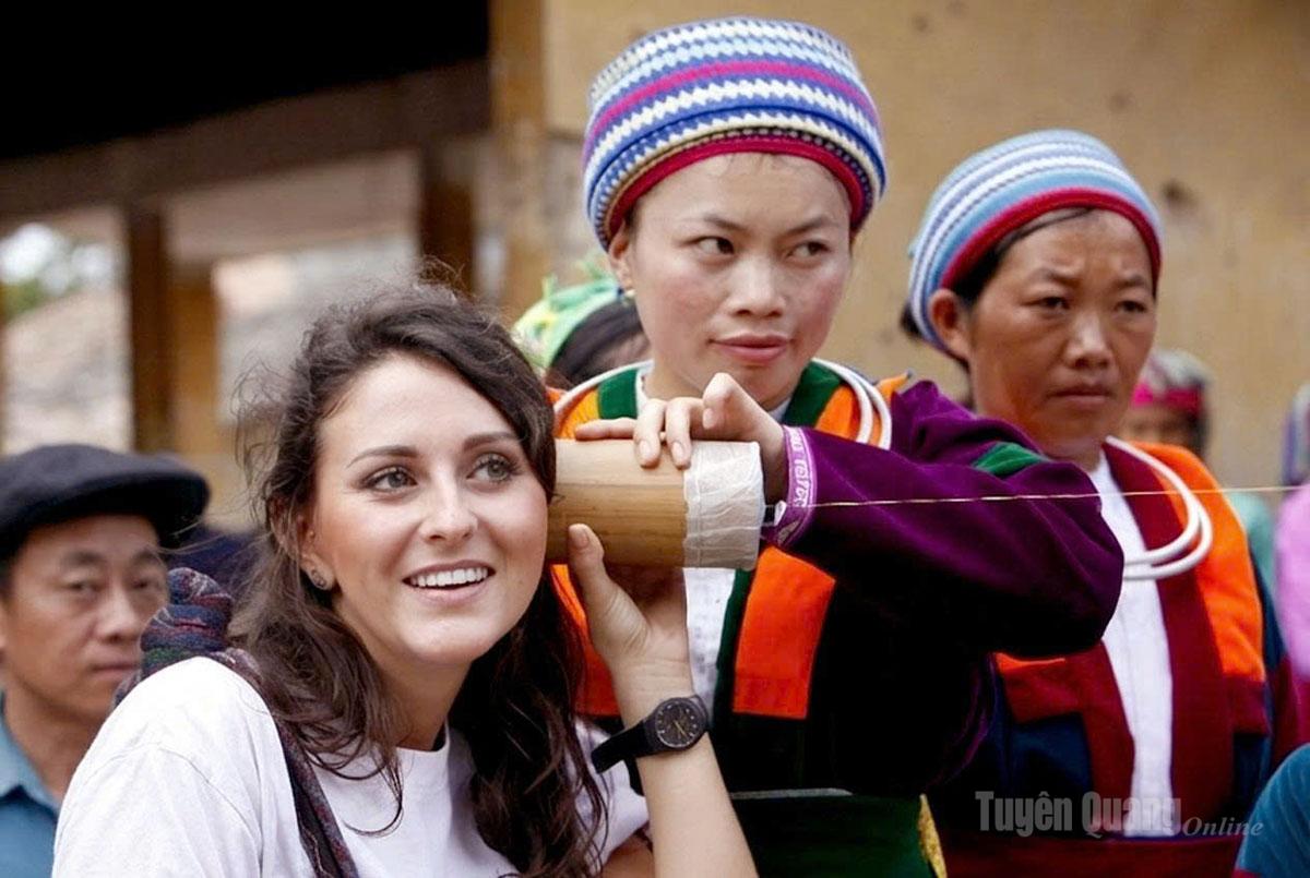 Du khách nước ngoài thưởng thức ẩm thực cùng người vùng cao.