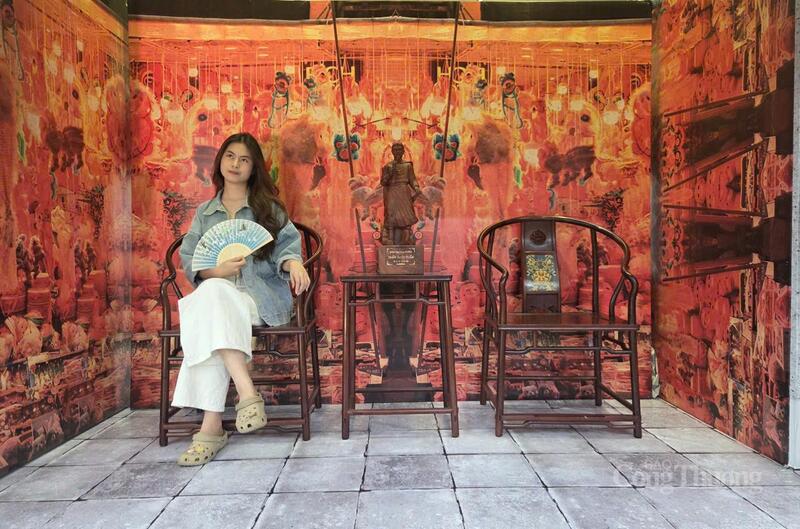 Các bạn trẻ thích thú chụp ảnh tại gian đồ gỗ của nghệ nhân Nguyễn Văn Cường tại không gian "Tinh hoa Thu Hà Nội".