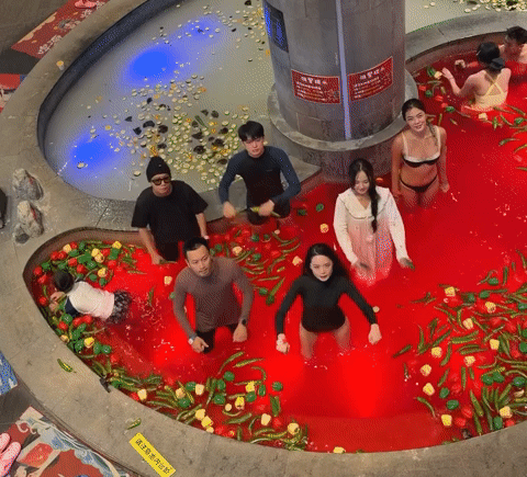 Trải nghiệm độc đáo này cho phép du khách đắm mình trong "nồi nước lẩu khổng lồ" ấm nóng, được pha chế từ các nguyên liệu như ớt, sữa, táo tàu hay kỷ tử - những thành phần quen thuộc trong các món ăn bổ dưỡng của người Trung Quốc.