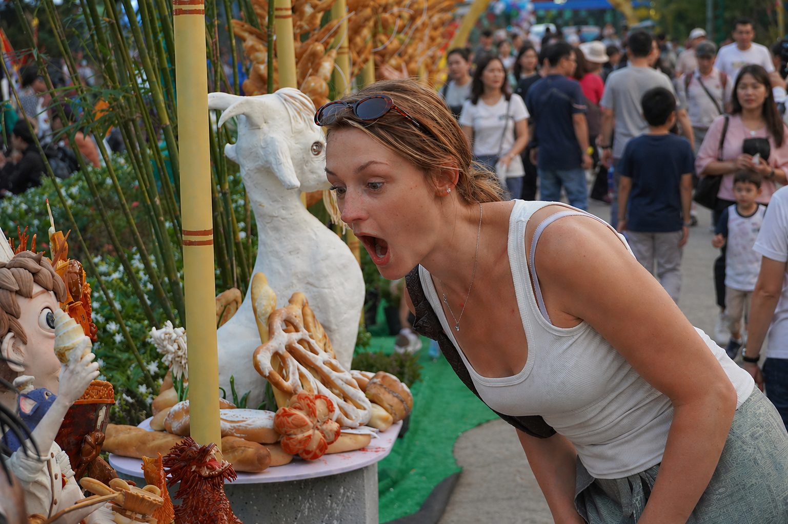 “Vỏ bánh giòn, phần nhân phong phú và đậm vị hơn tôi nghĩ”, chị Margaux nói, đồng thời cho biết bất ngờ khi nhiều khu vực đông kín, phải chen chân mới có thể tiếp cận. Ảnh: Nguyên Phong