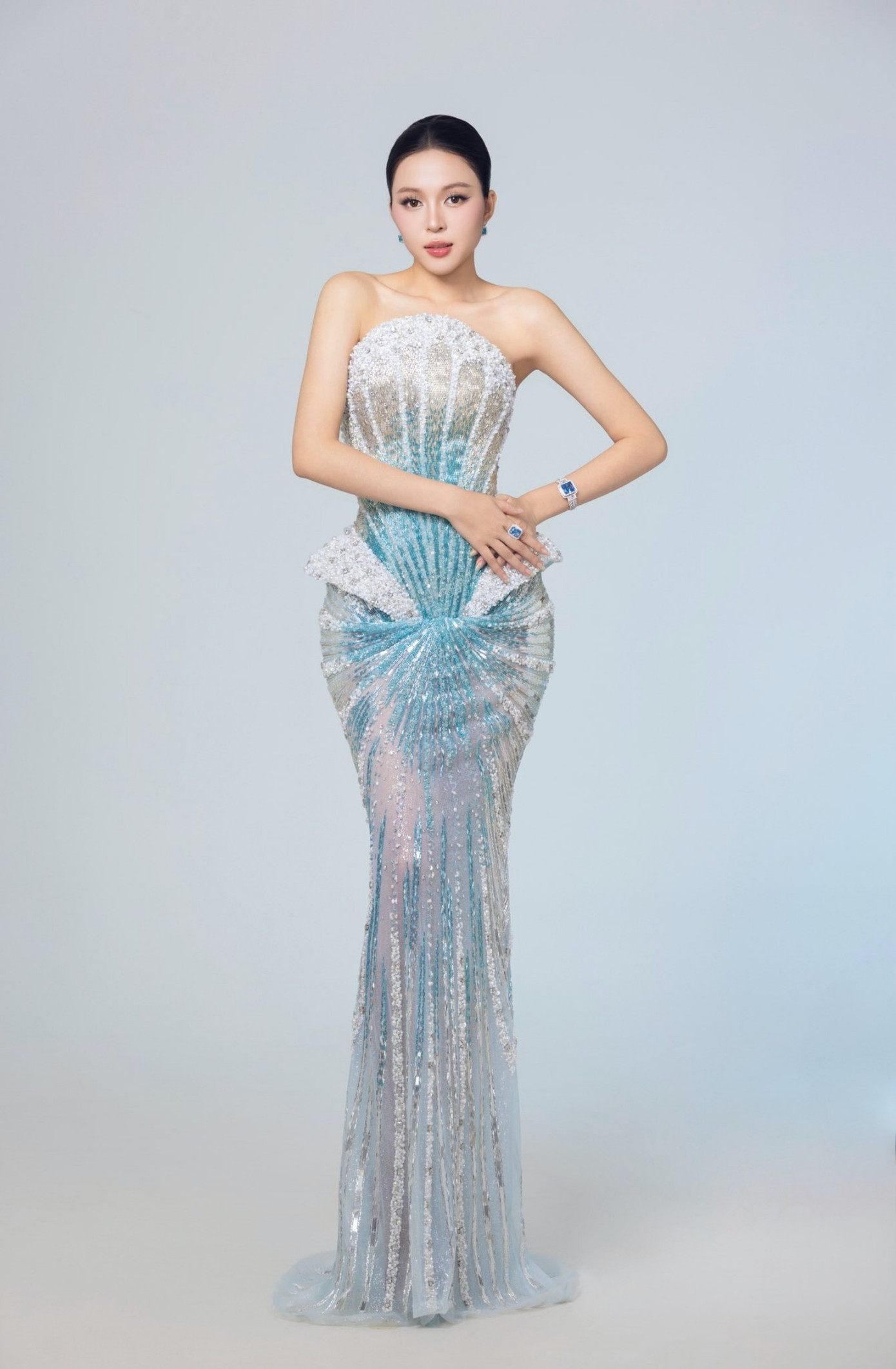 Kiều Duy diện thiết kế dạ hội ôm sát lấp lánh tông màu trắng xanh trong Chung kết Miss International 2025.