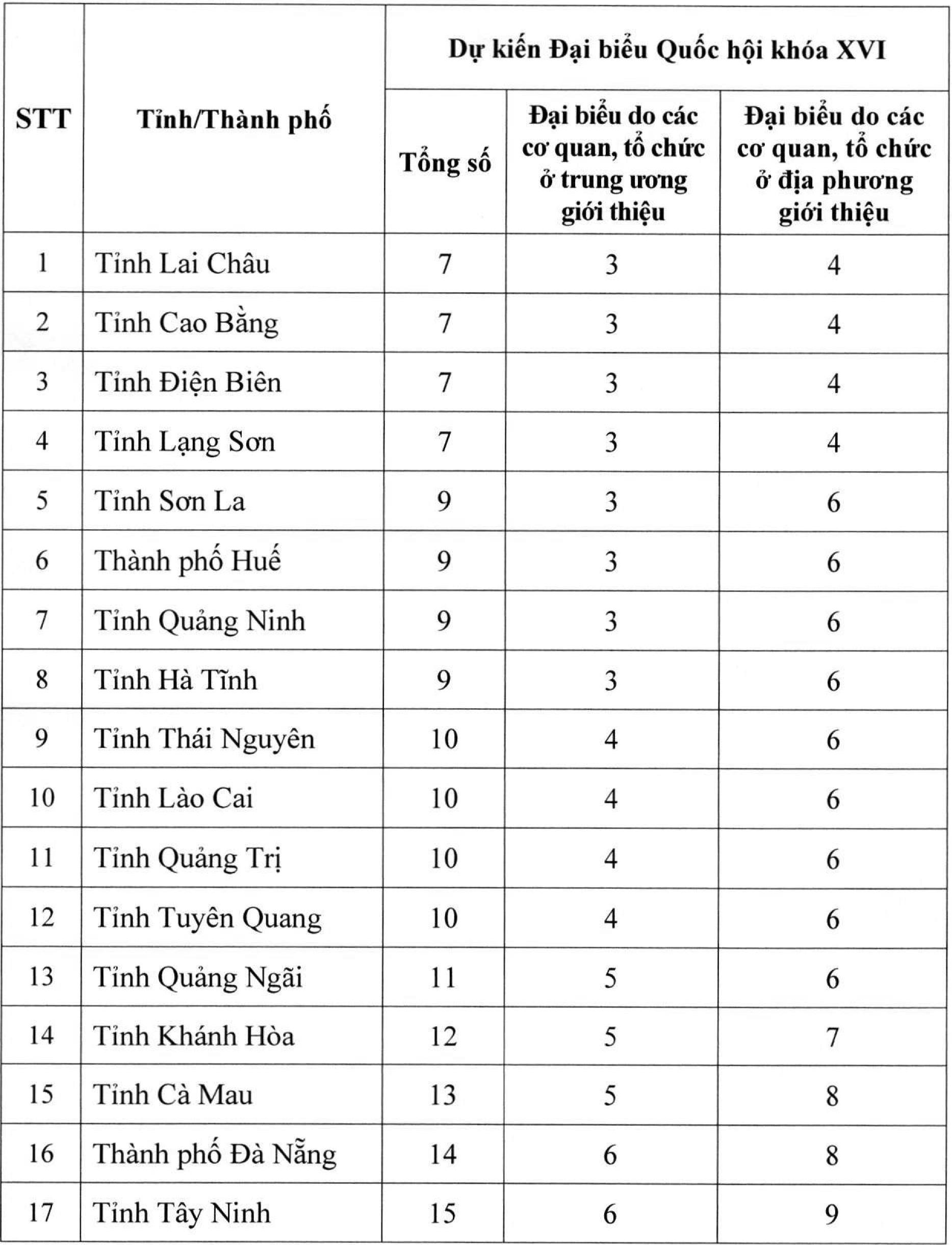 Dự kiến số lượng, cơ cấu, thành phần ĐBQH khóa XVI ở các tỉnh, thành phố: