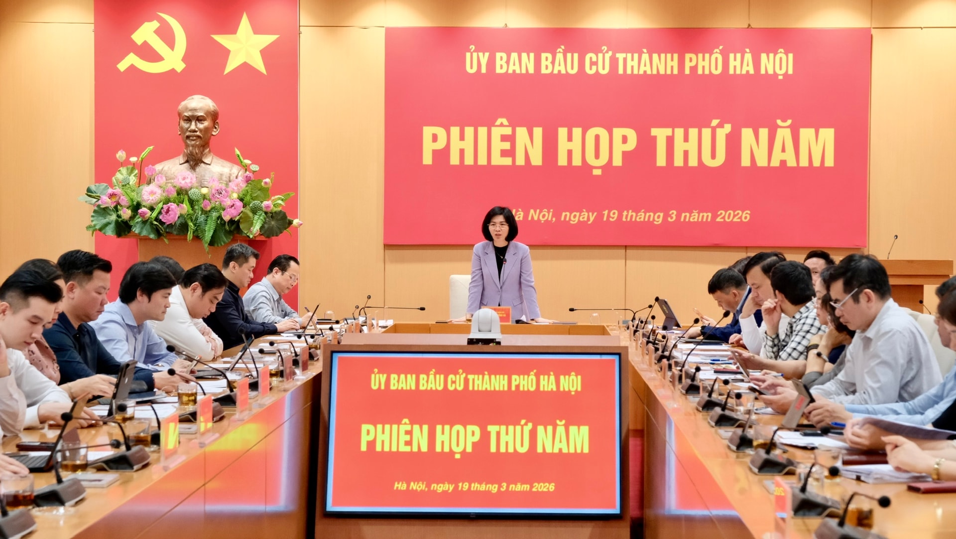 Phó Bí thư Thành ủy, Chủ tịch HĐND thành phố Phùng Thị Hồng Hà - Chủ tịch Ủy ban bầu cử thành phố chủ trì phiên họp.