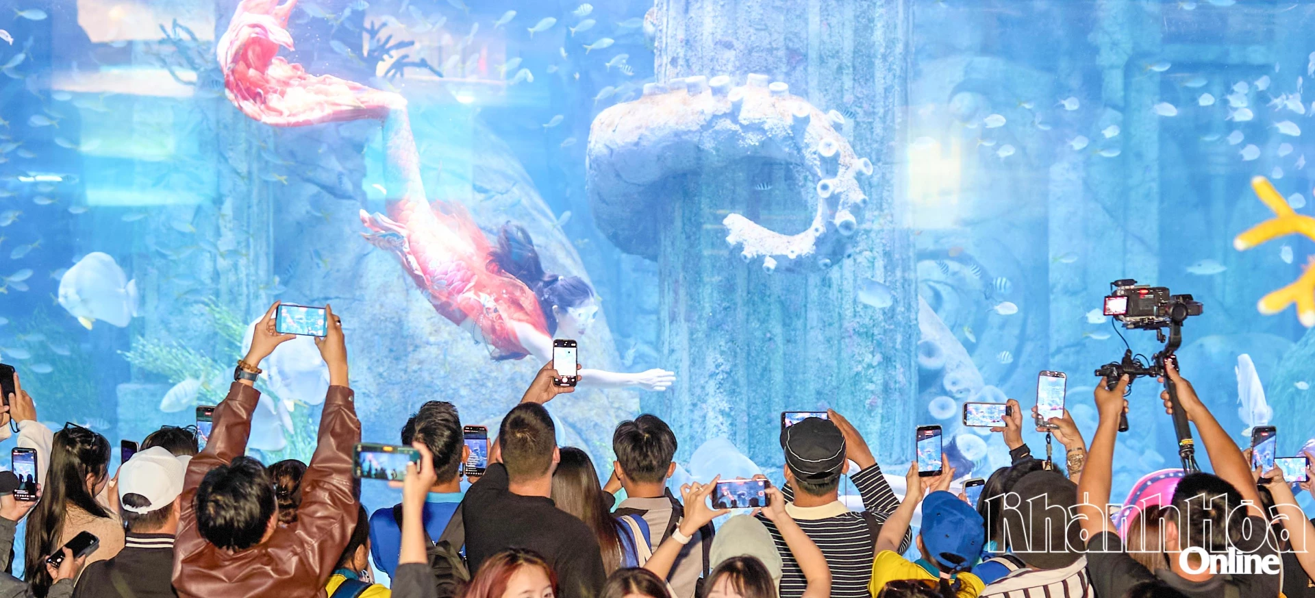 Khách xem show diễn nàng tiên cá tại thủy cung của VinWonders Nha Trang.