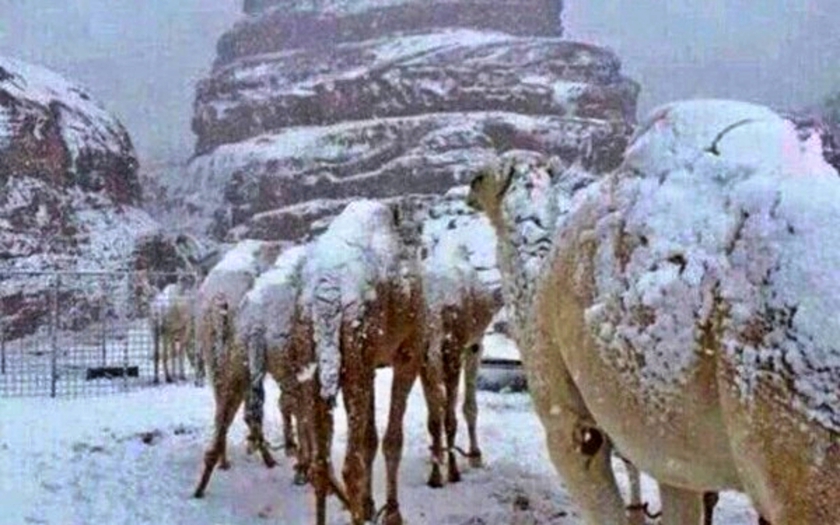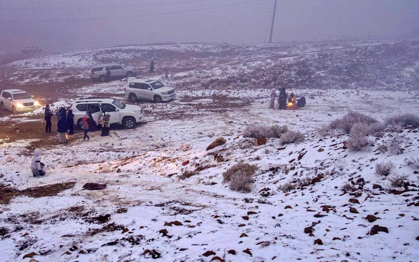 Tuyết rơi cuối tháng 12/2025 tại vùng cao nguyên Trojena và các dãy núi thuộc tỉnh Tabuk, tạo nên bức tranh thiên nhiên ngoạn mục, đối lập với hình ảnh sa mạc khô nóng vốn quen thuộc của Arab Saudi. Nhiều người dân và khách du lịch đổ tới trải nghiệm cảnh tuyết sa mạc độc lạ này. Ảnh: CNN