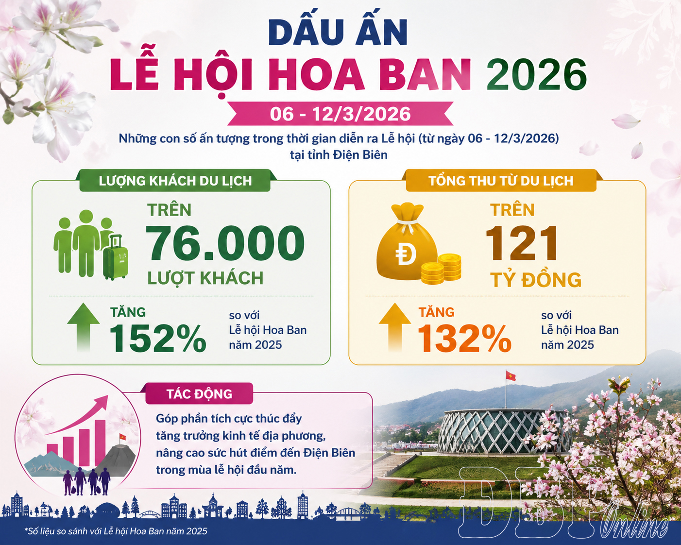 Cùng với đó, sự kiện năm nay ghi nhận sự tham gia của nhiều đoàn đại biểu quốc tế đến từ các tỉnh Bắc Lào, thành phố Phổ Nhĩ (tỉnh Vân Nam, Trung Quốc), cùng đại diện đại sứ quán các nước Nhật Bản, Thái Lan, Pháp và các tổ chức quốc tế. Điều này cho thấy sức lan tỏa và vai trò kết nối của lễ hội trong thúc đẩy hợp tác văn hóa, du lịch và kinh tế xuyên biên giới. Trong thời gian diễn ra Lễ hội Hoa Ban năm 2026, từ ngày 6 - 12/3, Điện Biên đón trên 76 nghìn lượt khách du lịch, tăng 152% so với năm trước; tổng thu từ du lịch đạt trên 121 tỷ đồng, tăng 132%.