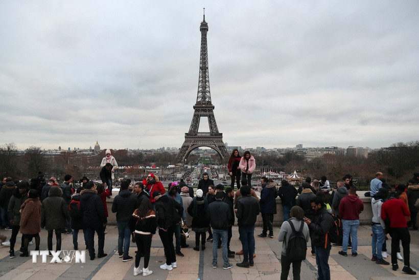 Khách du lịch chụp ảnh bên Tháp Eiffel ở thủ đô Paris, Pháp. (Ảnh: AFP/TTXVN)