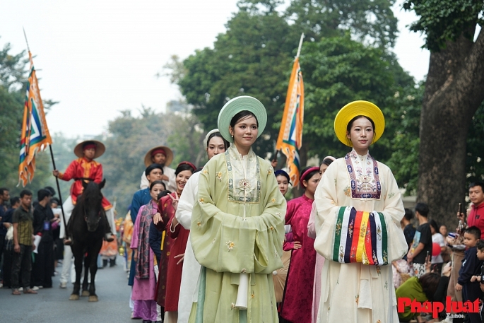 Lễ hội Việt phục “Bách hoa hỷ sự” đã tạo nên một điểm nhấn văn hóa độc đáo tại Hồ Hoàn Kiếm. Ảnh: Khánh Huy.