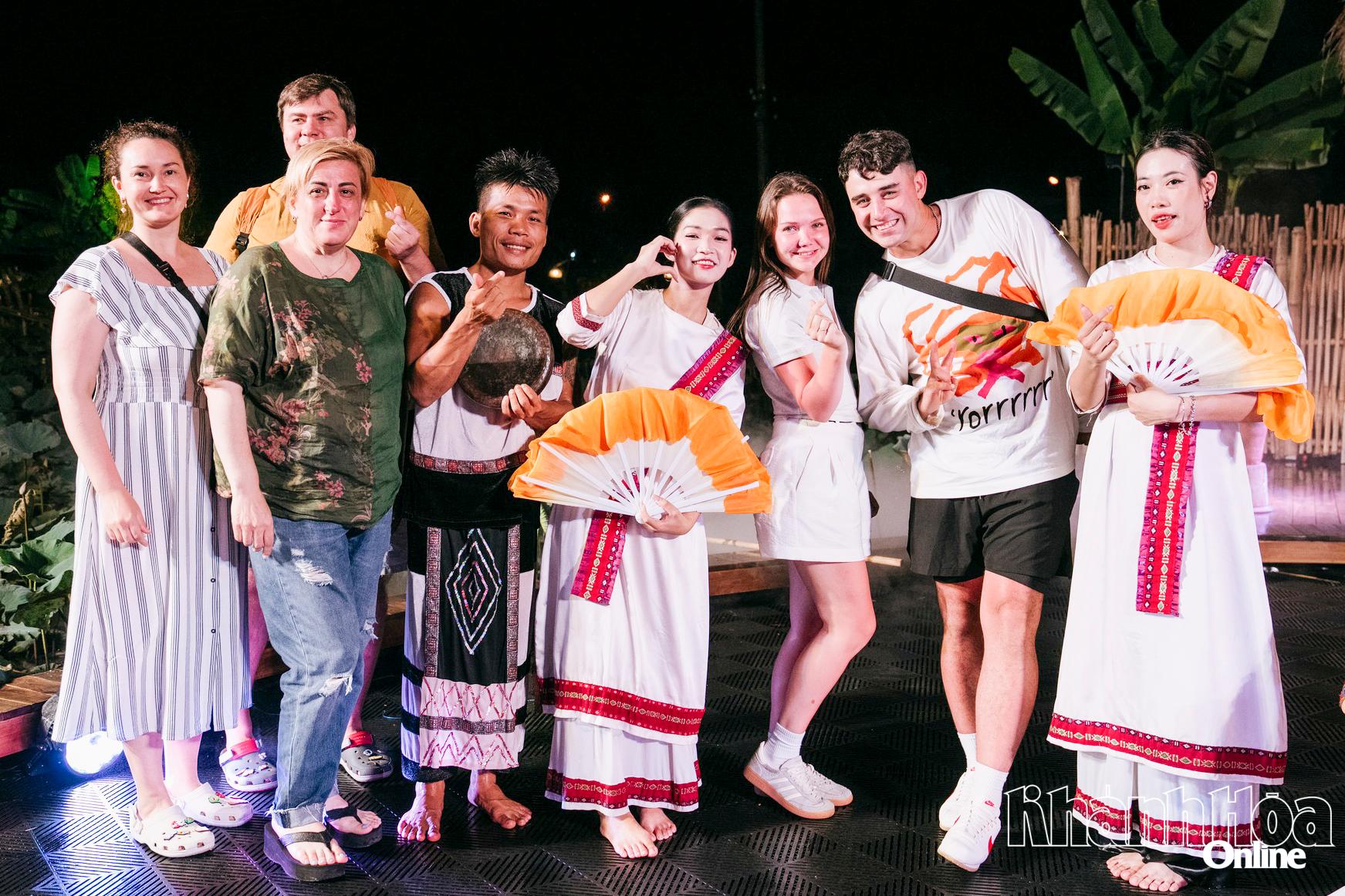 Khách du lịch nước ngoài chụp ảnh lưu niệm với các diễn viên biểu diễn nghệ thuật ở Làng nghề Nha Trang Xưa.