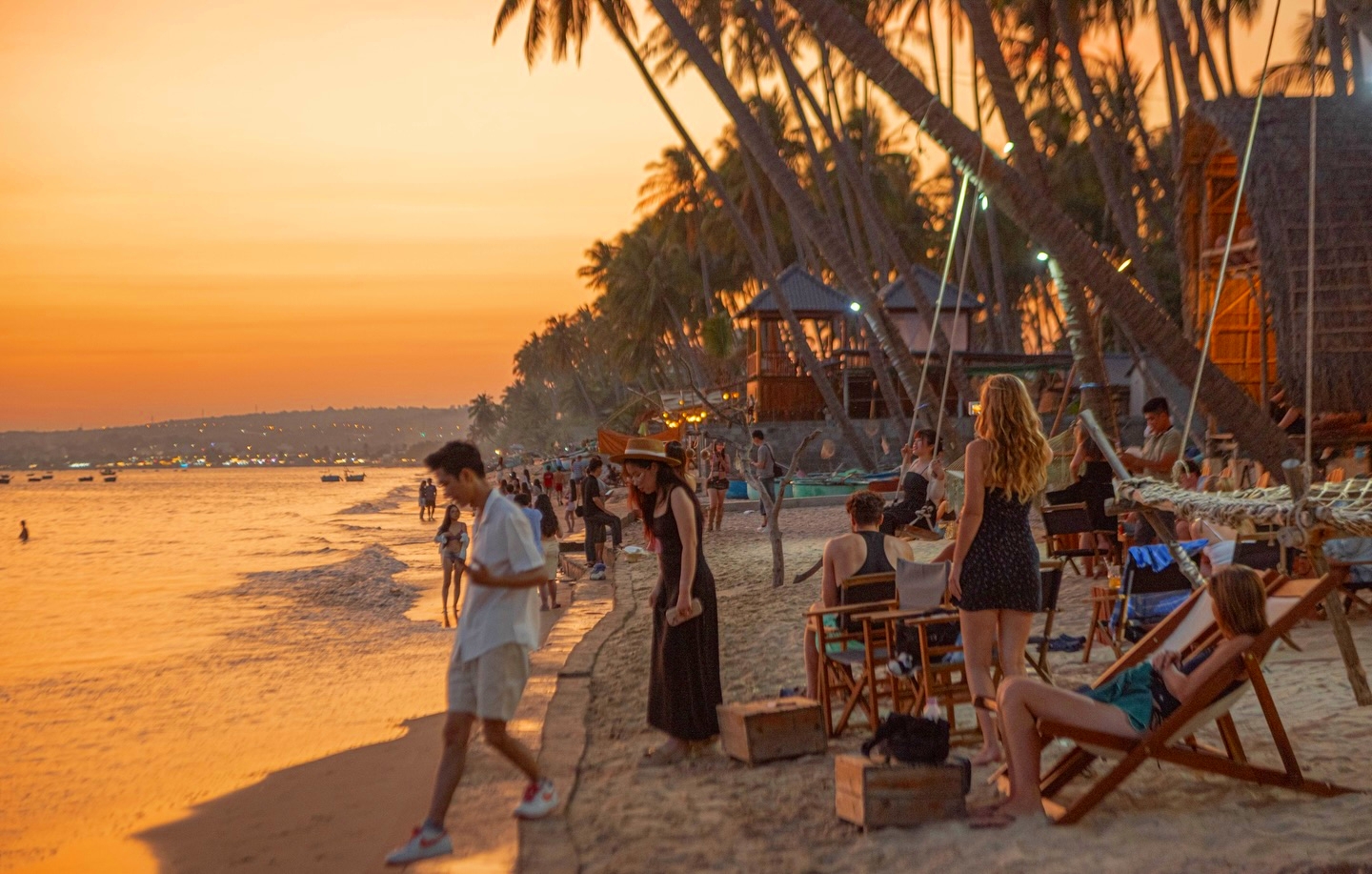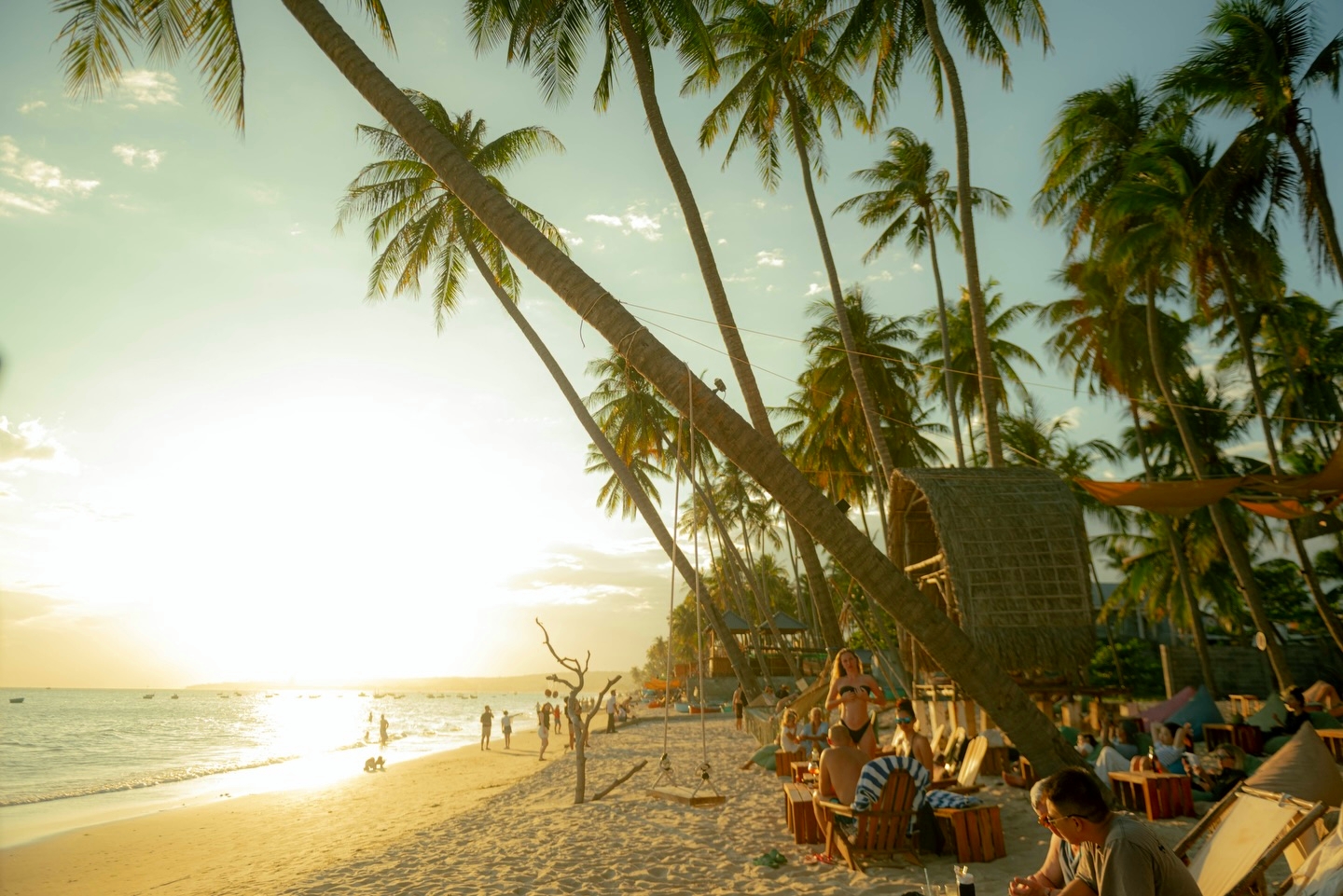 Bãi biển Mũi Né với đặc trưng hàng dừa nghiêng nổi tiếng toàn cầu.