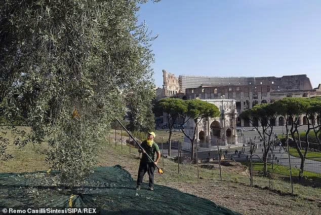 Thu hoạch ô liu từ hàng trăm cây trên đồi Palatine, Rome. Ảnh: Dailymail
