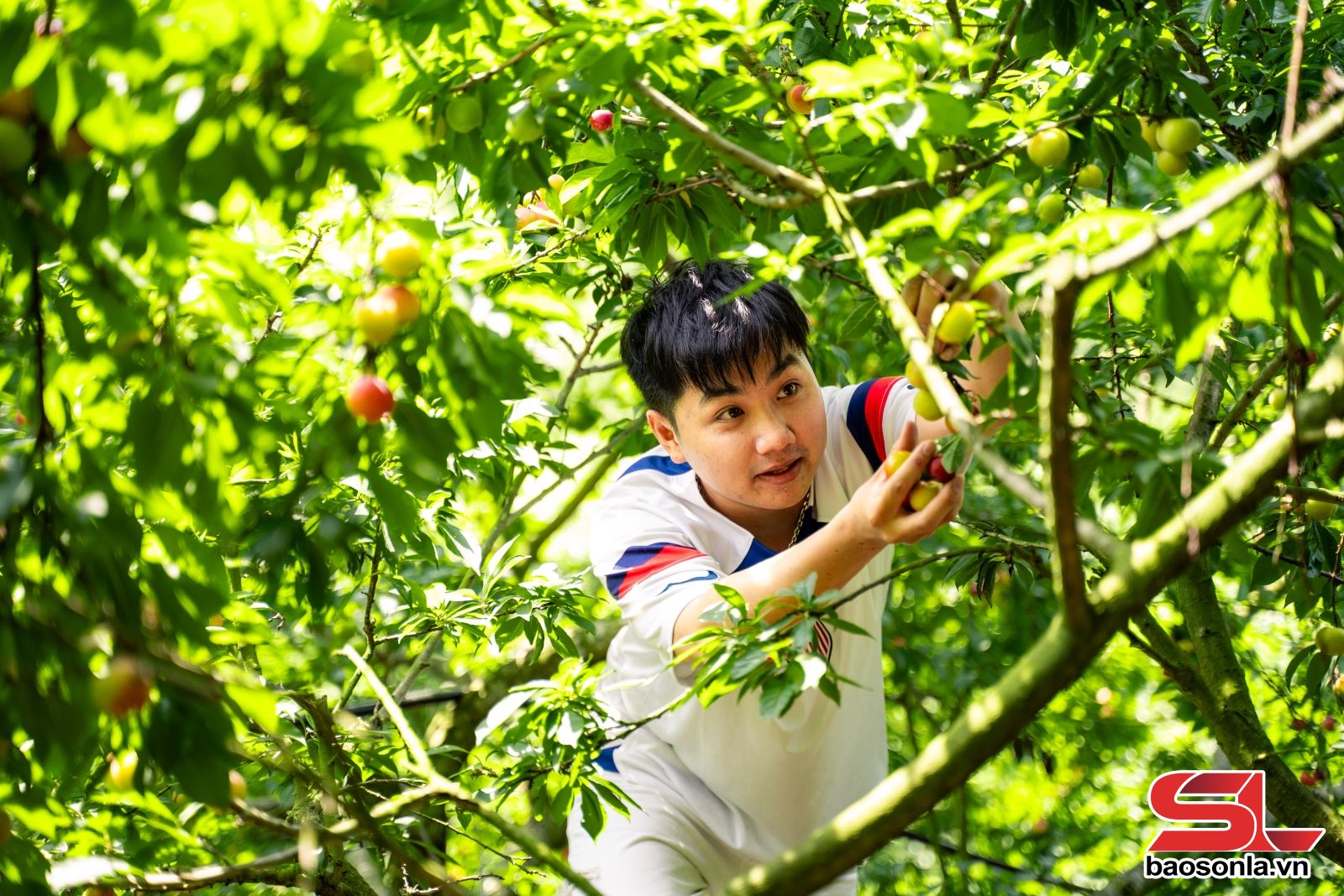 Du khách trải nghiệm hái mận tại Thung lũng mận Nà Ka, phường Thảo Nguyên.