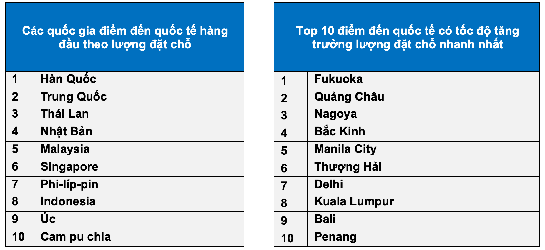 Nhật Bản dù xếp thứ về tổng lượng khách nhưng lại ghi nhận mức tăng trưởng ấn tượng tại một số thành phố: Fukuoka tăng hơn 300% và Nagoya tăng hơn 200%. Ngoài ra, các thị trường quen thuộc như Úc hay Hàn Quốc vẫn duy trì sức hút nhờ sự đa dạng trải nghiệm.