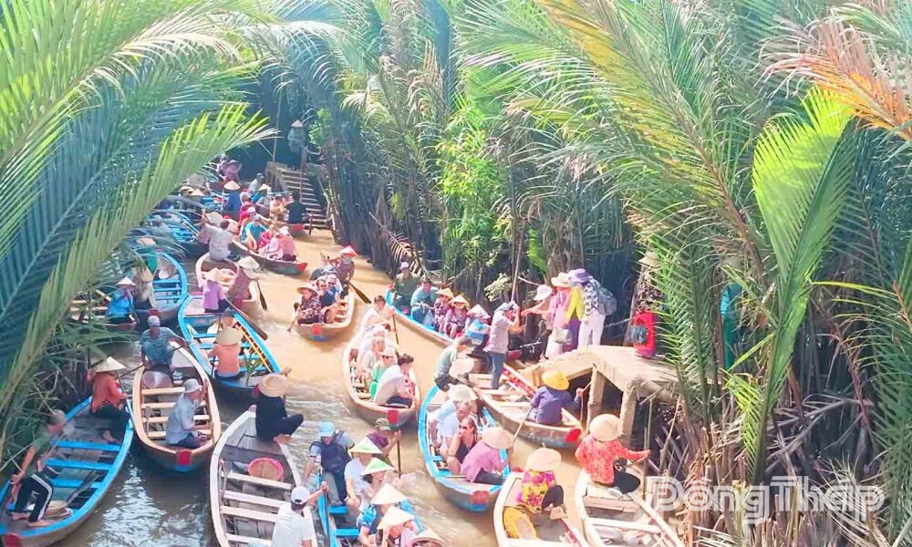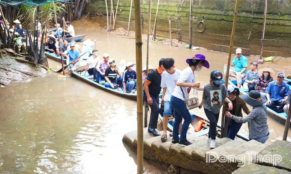 Du khách trải nghiệm xuồng chèo trên rạch Bà Ngoạn – nét đặc trưng của du lịch Thới Sơn.