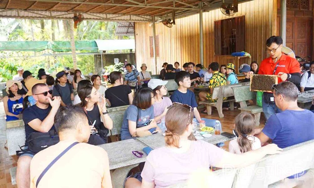 Du khách được trải nghiệm quy trình nuôi ong lấy mật và thưởng thức mật ong tại Cồn Thới Sơn.