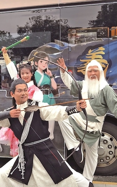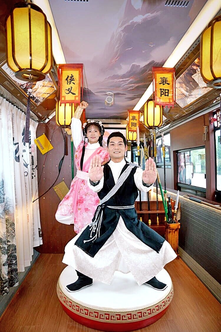 Không lâu sau, một chiếc xe buýt được trang trí hình ảnh hoạt hình của Quách Tĩnh và Hoàng Dung từ từ tiến vào bến. Hành khách lần lượt lên xe, bắt đầu hành trình “xuyên không” đầy thú vị.