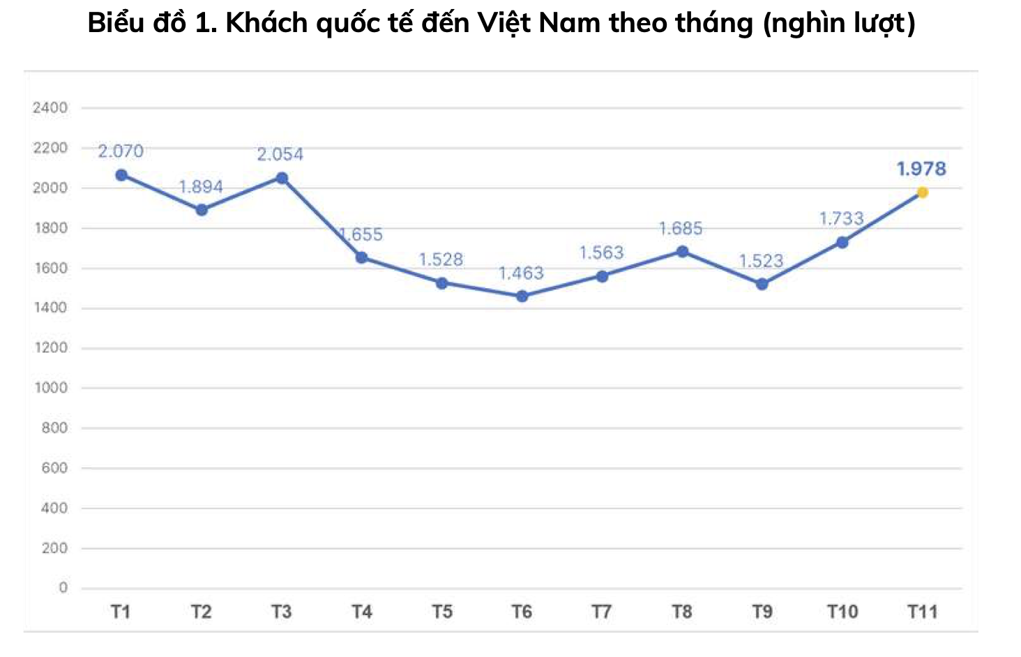 Riêng trong tháng 11/2025, Việt Nam đón gần 2 triệu lượt khách quốc tế, tăng 14,1% so với tháng trước và tăng 15,6% so với cùng kỳ năm 2024. Đây là tháng có lượng khách quốc tế cao thứ 3 tính từ đầu năm (tháng 1 và tháng 3 đạt trên 2 triệu lượt).