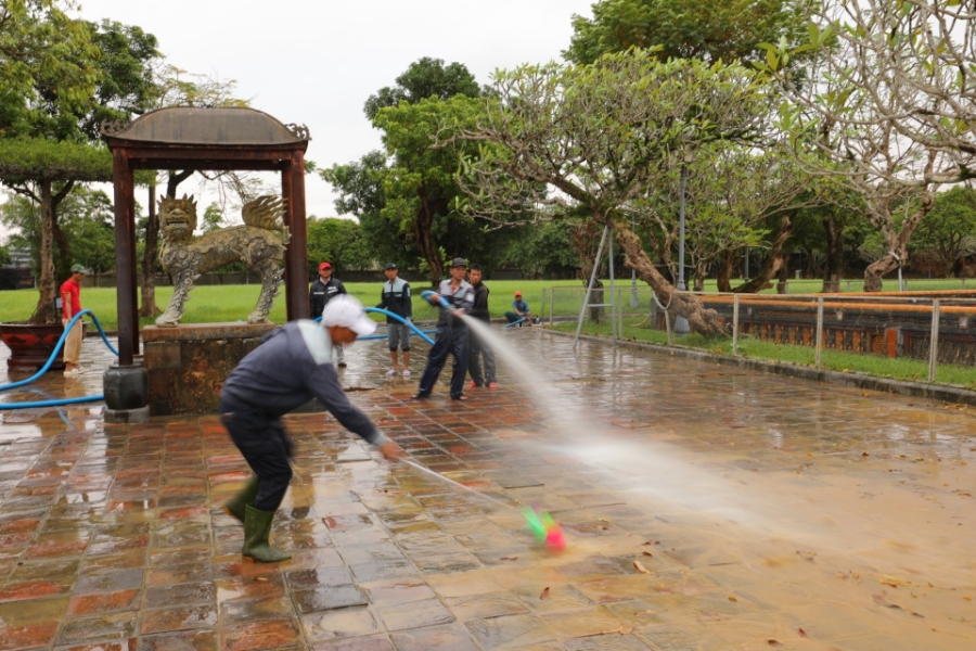 Công tác dọn dẹp, vệ sinh sau mưa lũ tại Quần thể Di tích Cố đô Huế sáng ngày 4/11.