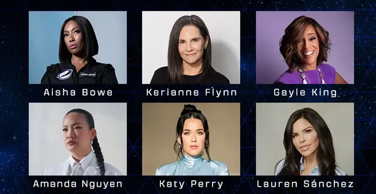 6 thành viên của sứ mệnh gồm: ca sĩ Katy Perry; nhà báo và nhà từ thiện Lauren Sánchez; nhà hoạt động nhân quyền Amanda Nguyễn; người dẫn chương trình Gayle King; nhà khoa học NASA kiêm doanh nhân Aisha Bowe; nhà sản xuất phim Kerianne Flynn.