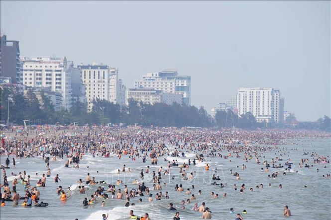Du khách đến tắm biển Sầm Sơn dịp nghỉ lễ Giỗ Tổ Hùng Vương. Ảnh: Việt Hoàng/TTXVN
