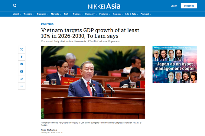 Bài viết trên Nikkei Asia đã tập trung vào bản báo cáo của Ban Chấp hành Trung ương Đảng khóa XIII về các văn kiện trình Đại hội XIV của Đảng, do Tổng Bí thư Tô Lâm trình bày tại phiên khai mạc và những mục tiêu phát triển kinh tế của Việt Nam trong giai đoạn tới.