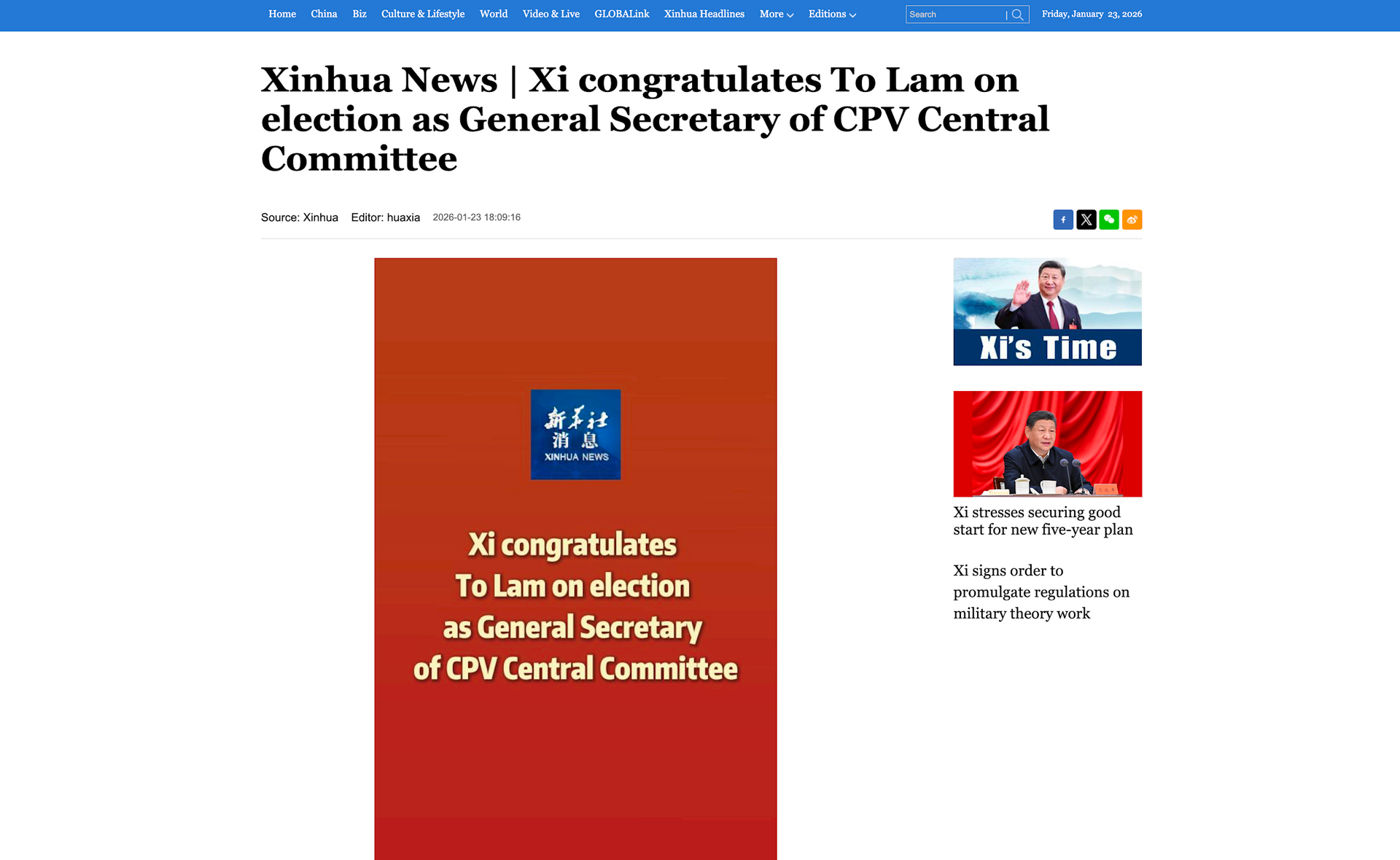 Tân Hoa Xã đưa tin Chủ tịch Trung Quốc Tập Cận Bình chúc mừng Tổng Bí thư Tô Lâm. Ảnh chụp màn hình.