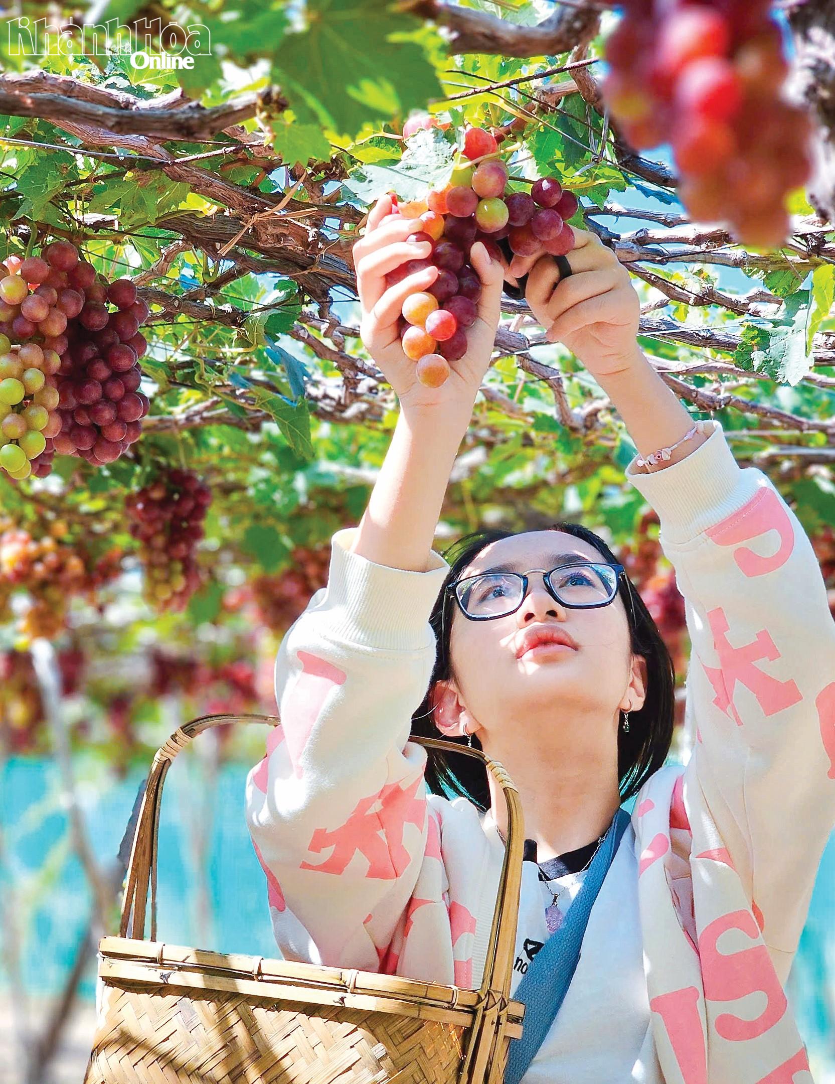 Du khách trải nghiệm tại vườn nho Ngọc Nga, thôn Thái An, xã Vĩnh Hải.