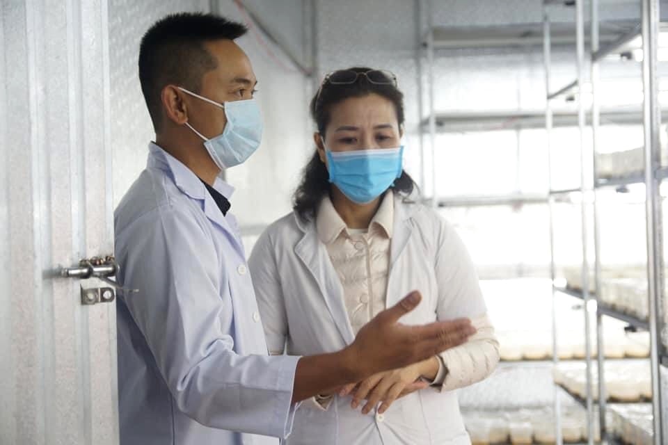 Anh Nguyễn Thành Luận trao đổi với đại diện của Bộ Nông nghiệp và Môi trường về ứng dụng công nghệ hiện đại để sản xuất nấm đông trùng hạ thảo chất lượng. Ảnh: T.L