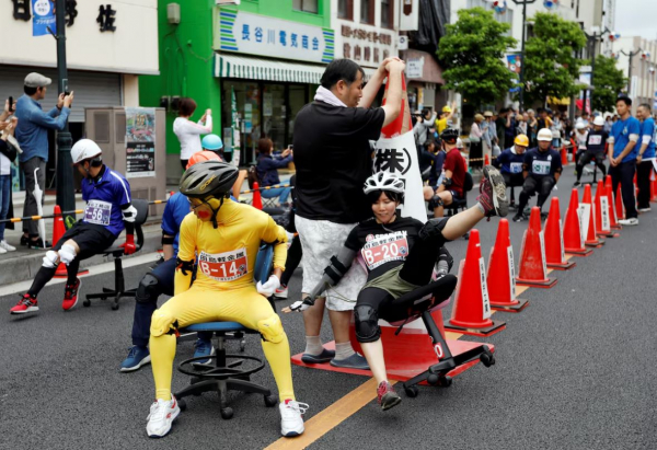 Hình ảnh do CNN đăng tải cho thấy hàng chục nhân viên văn phòng đội mũ bảo hộ, đi giày thể thao, ngồi trên ghế xoay rồi đạp chân xuống đất, lao vun vút về phía trước trong tiếng reo hò cổ vũ của khán giả. Kể từ khi được tổ chức lần đầu ở tỉnh Kyoto năm 2009, môn thể thao này đã lan rộng trên toàn quốc. Mỗi năm, giải được tổ chức tại 10 thành phố, trong đó có Tokyo, Kyoto và Shizuoka. Dù mang tính giải trí, cuộc đua đòi hỏi thể lực và kỹ thuật cao.