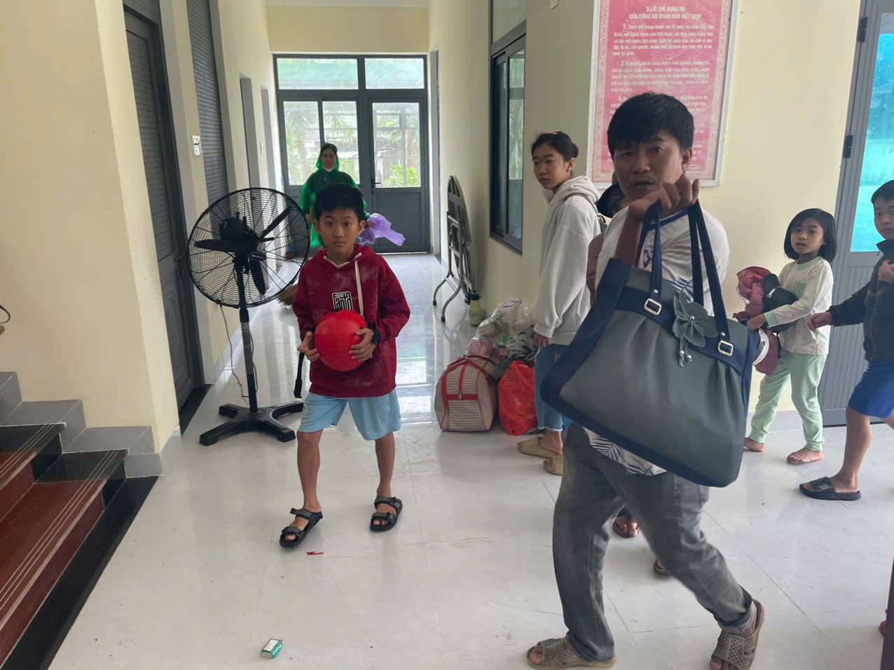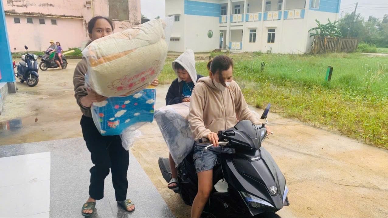 Người dân mang theo đồ dùng thiết yếu khi tránh trú bão