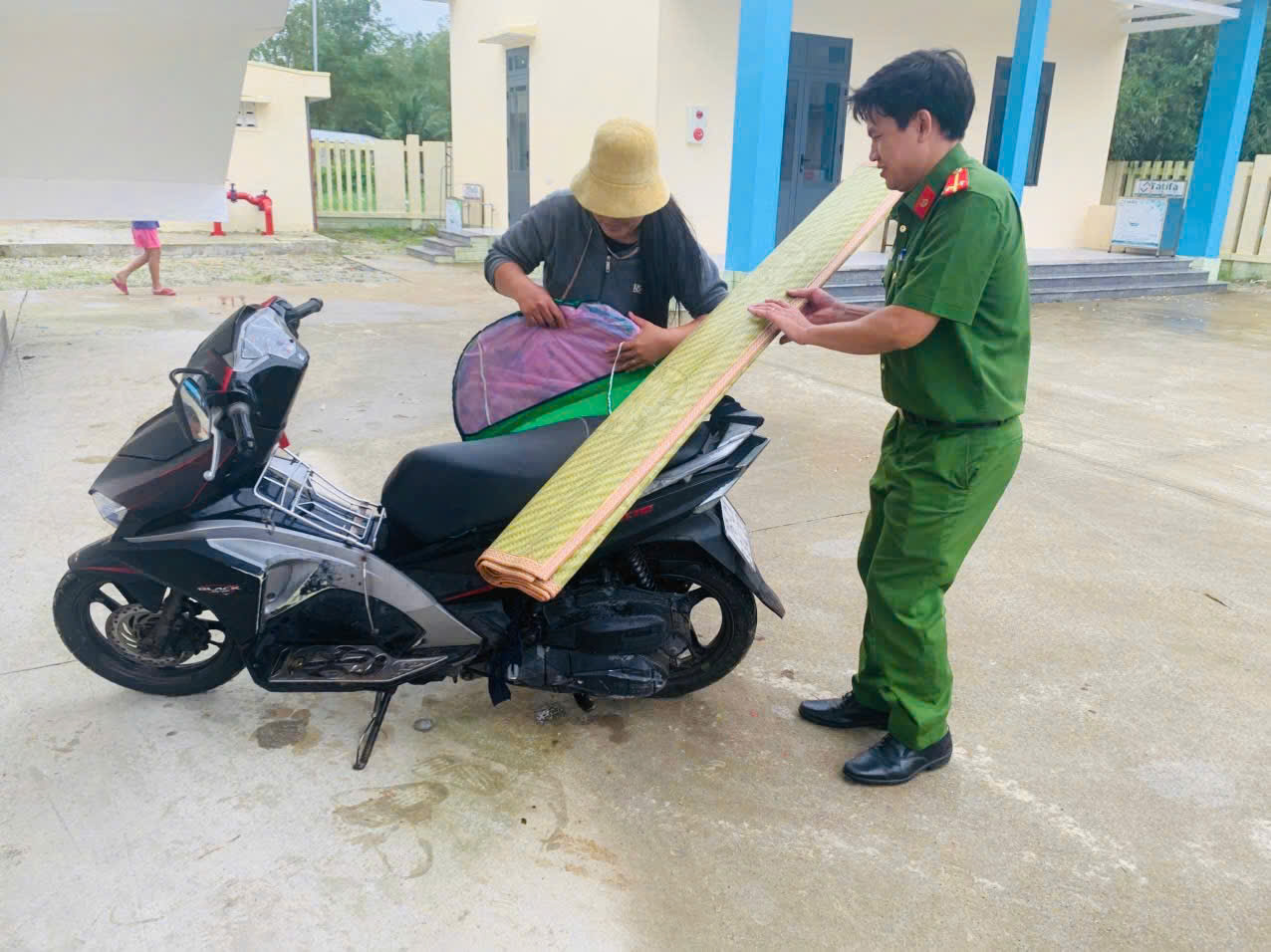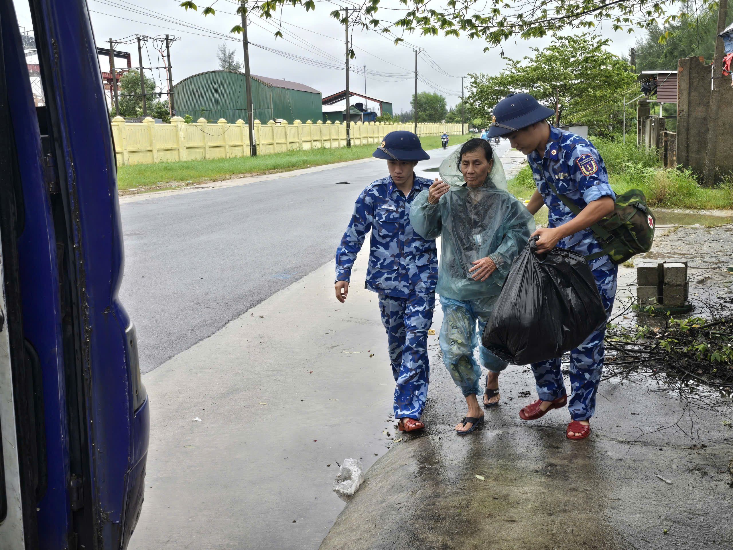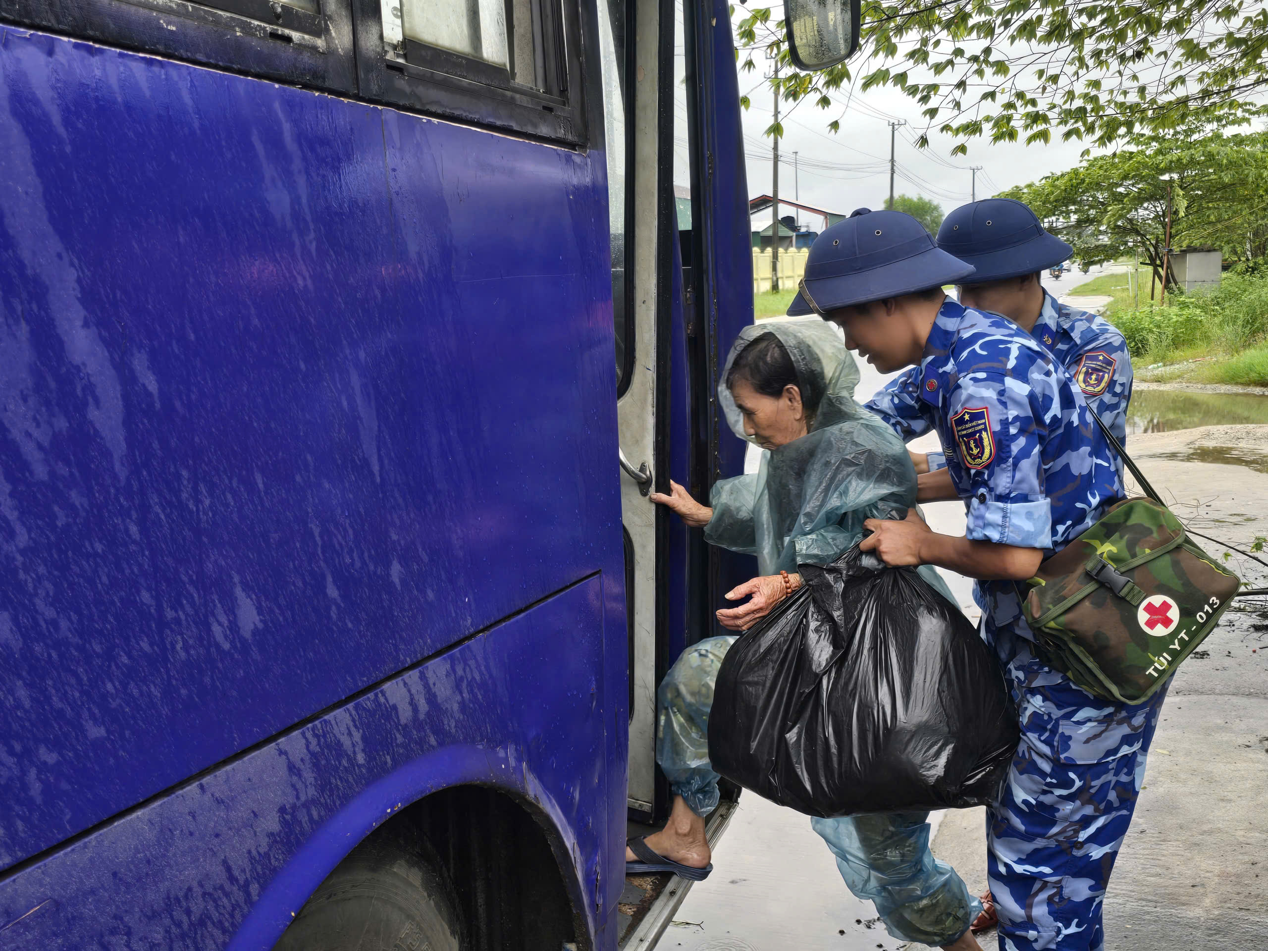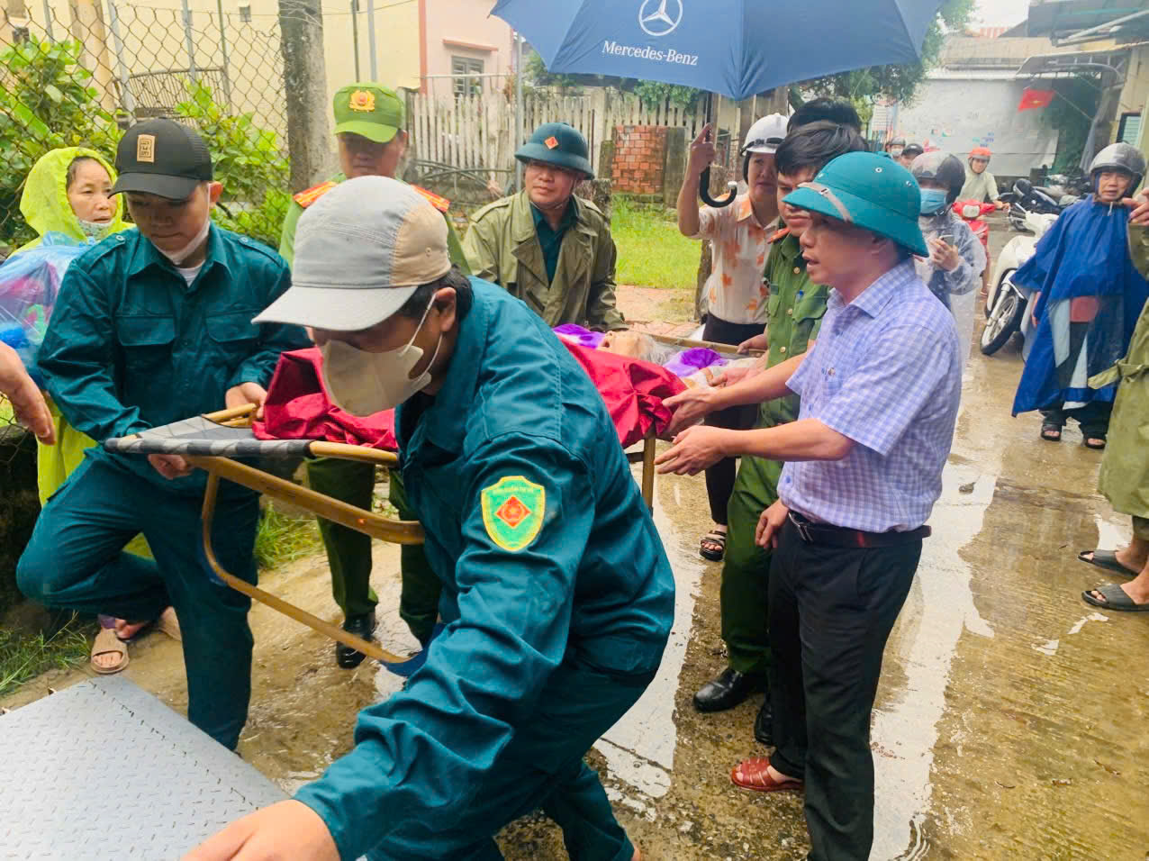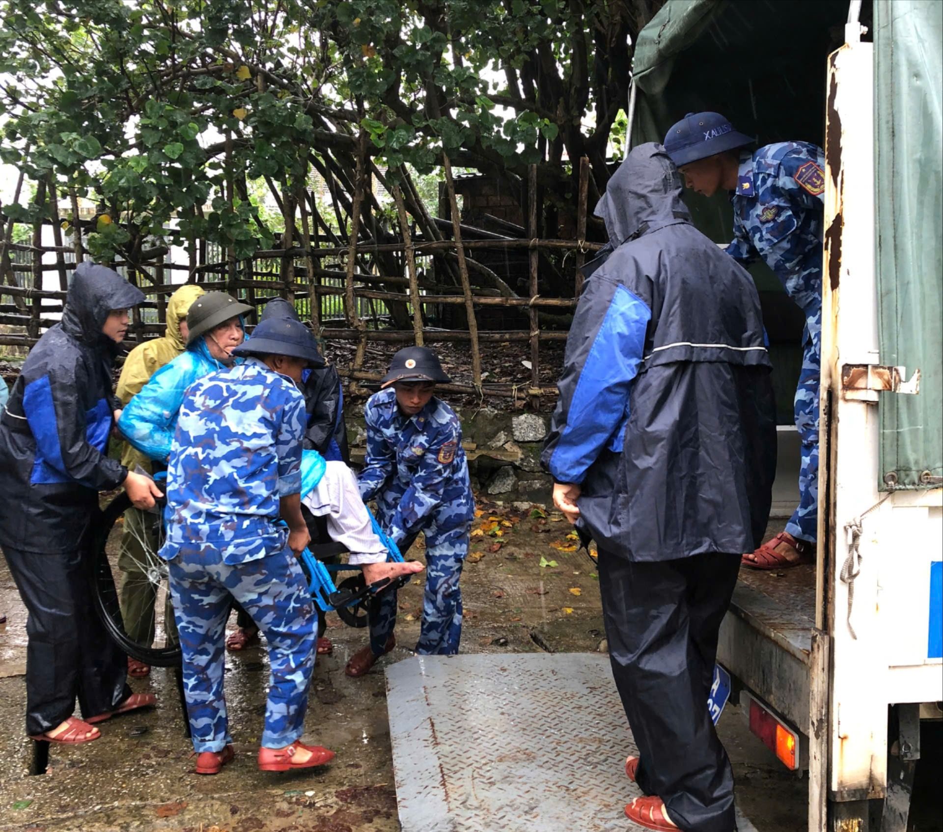 Lãnh đạo xã Bình Sơn và lực lượng dân quân hỗ trợ đưa cụ bà bị tai biến ở thôn Mỹ Tân đến bệnh viện, để đảm bảo an toàn vừa tránh bão, vừa chăm sóc y tế kịp thời