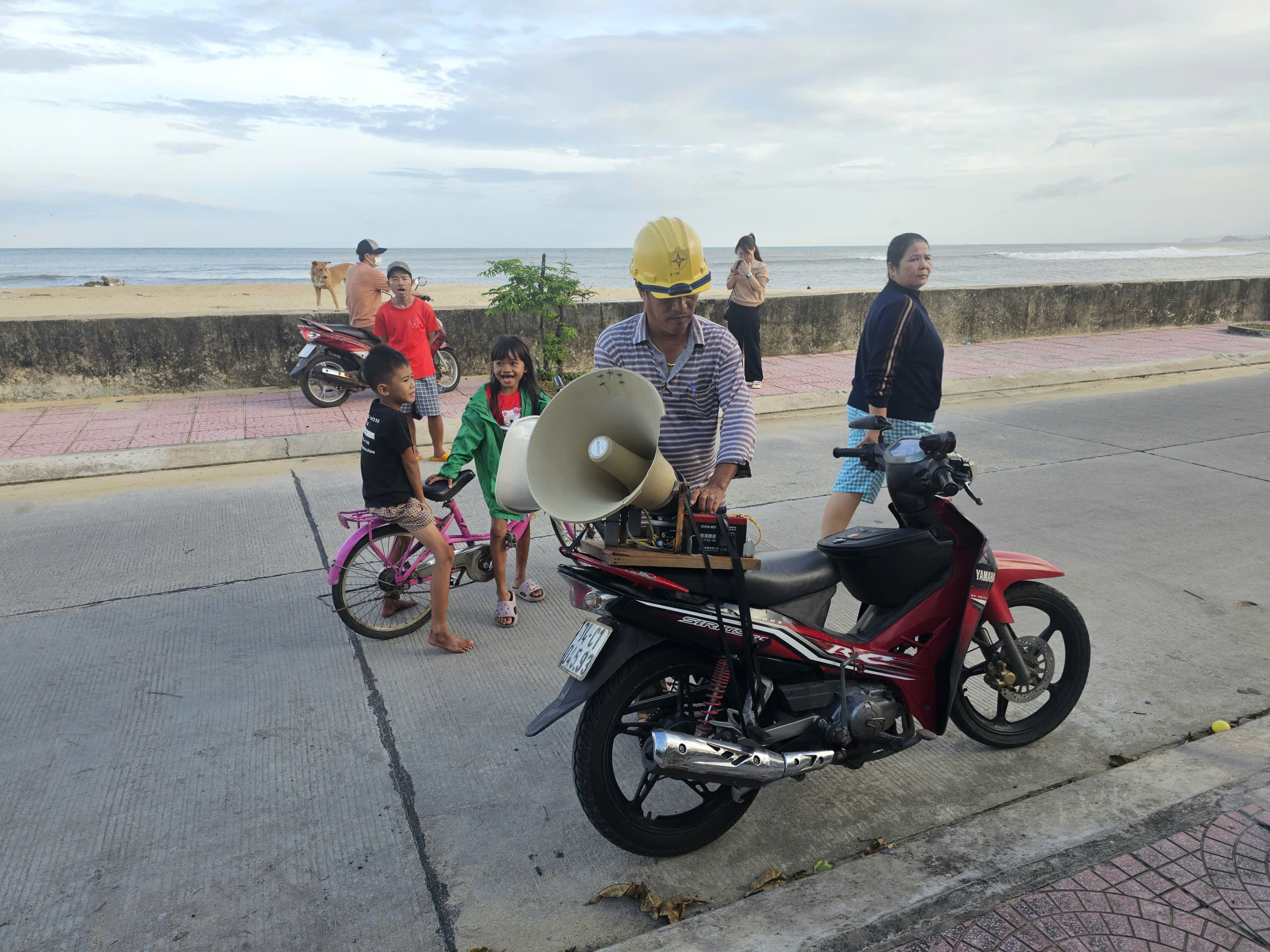 Ông Phạm Hồng Hưng, Tổ trưởng Tổ dân phố Thạch Bi 2, phường Sa Huỳnh dùng xe máy chở hai loa phát thanh đi khắp khu dân cư nhắc nhở người dân ứng phó bão số 13.