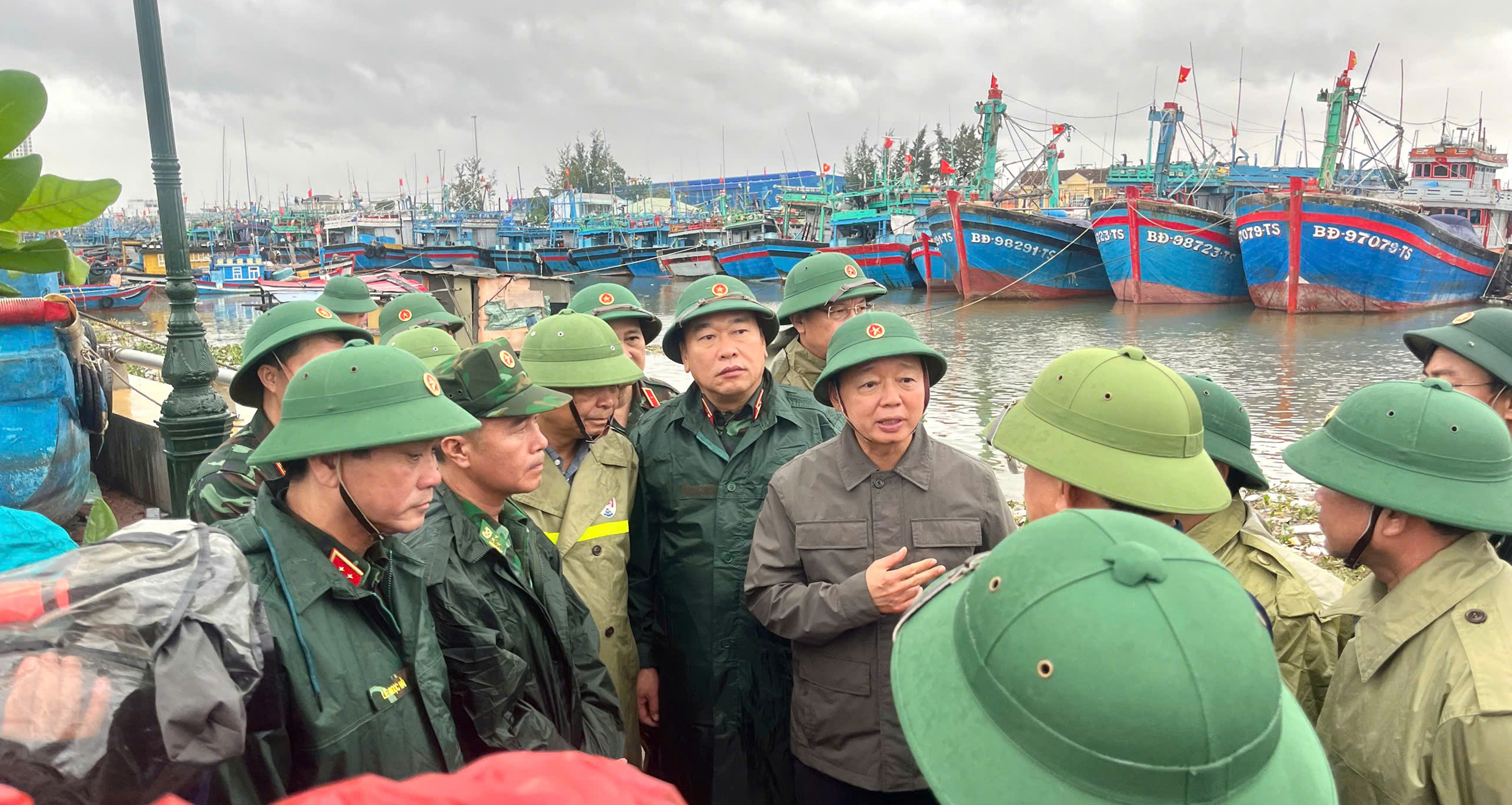 Tại Cảng cá Quy Nhơn, Trung tướng Lê Ngọc Hải biểu dương tinh thần chủ động của cấp ủy, chính quyền và lực lượng vũ trang địa phương trong triển khai phương án ứng phó bão, đồng thời yêu cầu thực hiện nghiêm phương châm “4 tại chỗ”, nắm chắc tình hình, không để bị động, bất ngờ.
