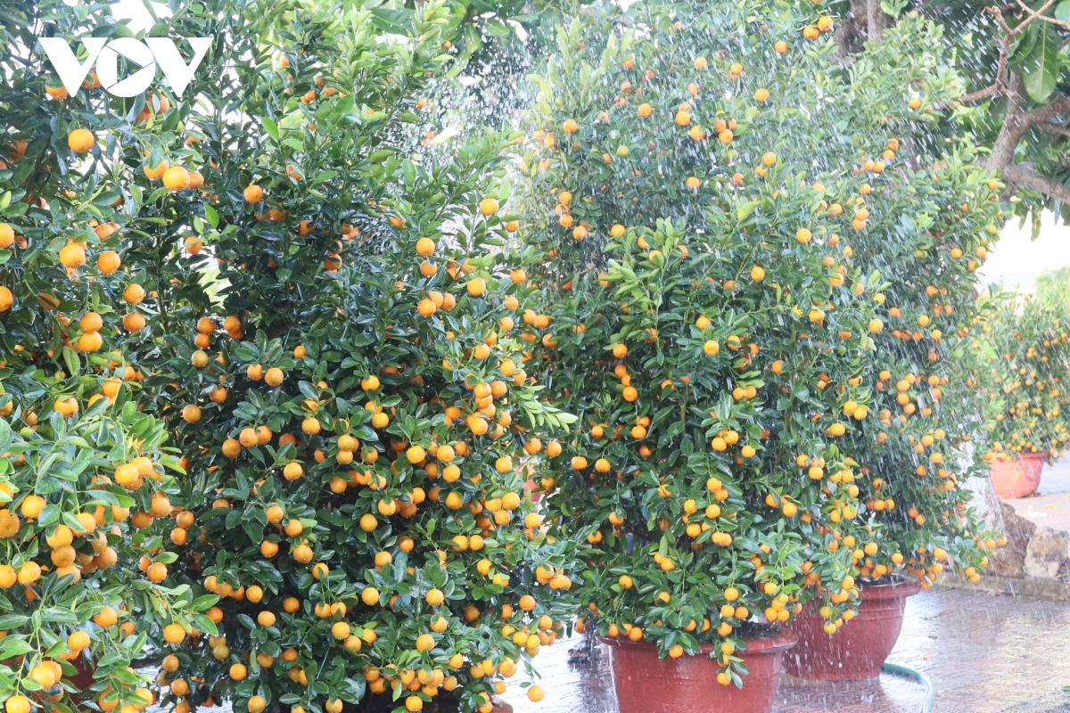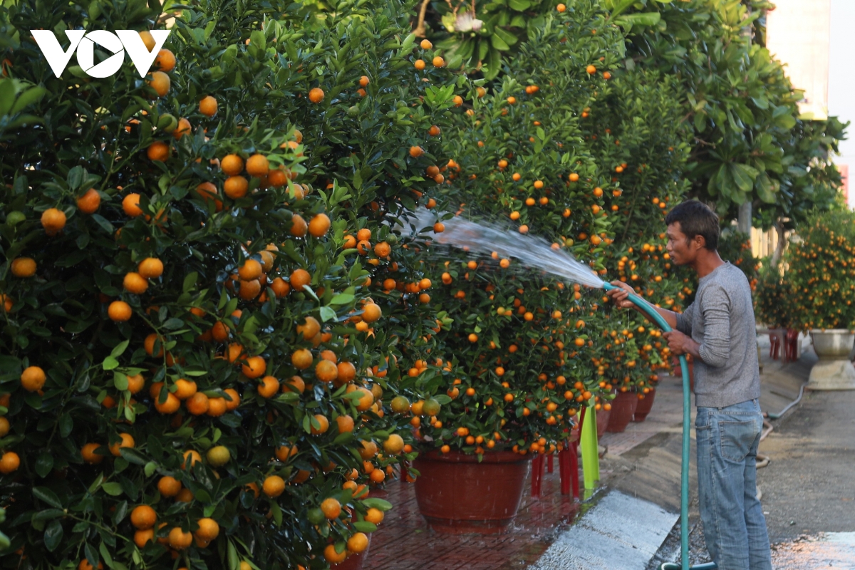 Anh Mai Văn Triển, trú thôn Đông An Vĩnh, đặc khu Lý Sơn chăm sóc các chậu quất Tết.