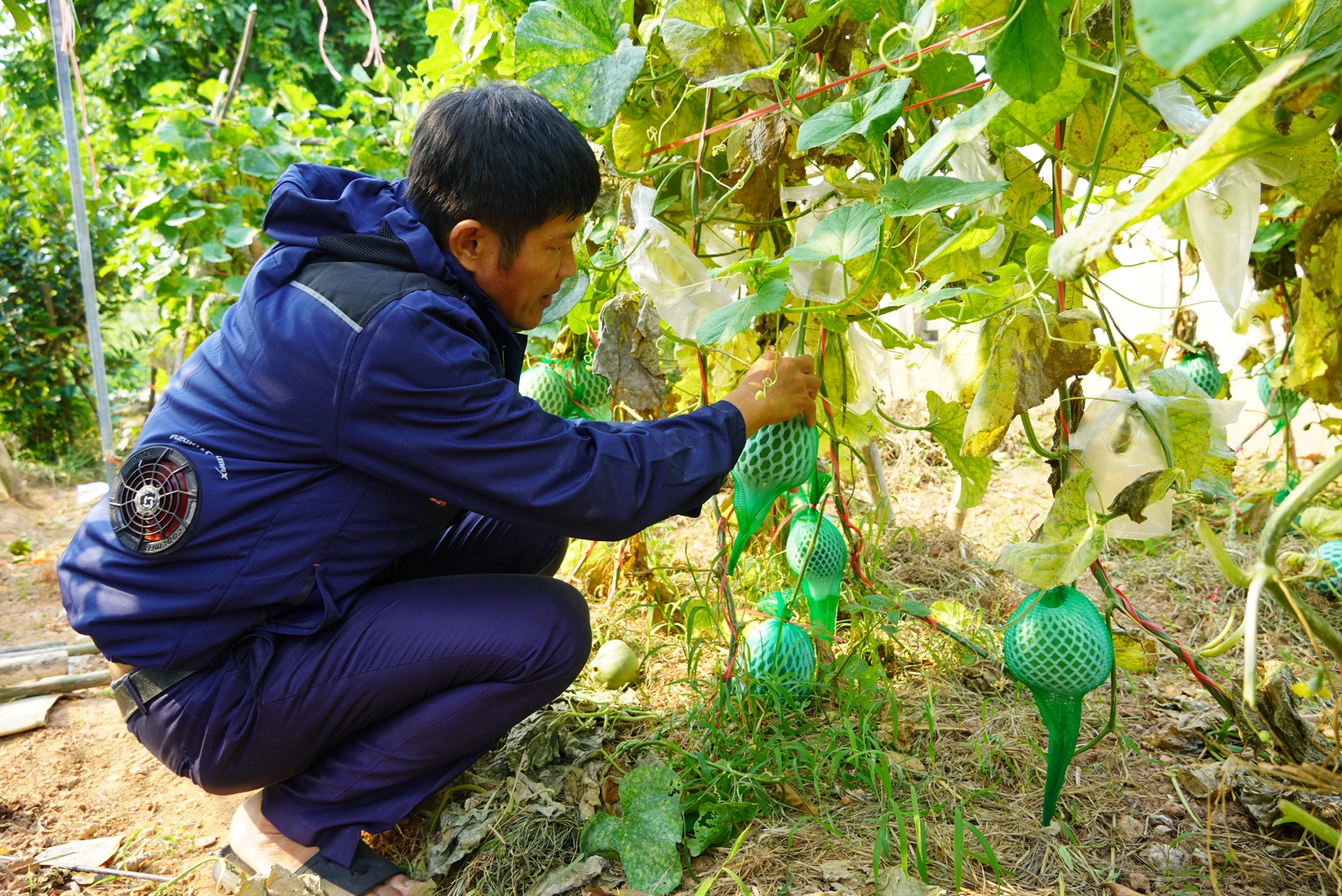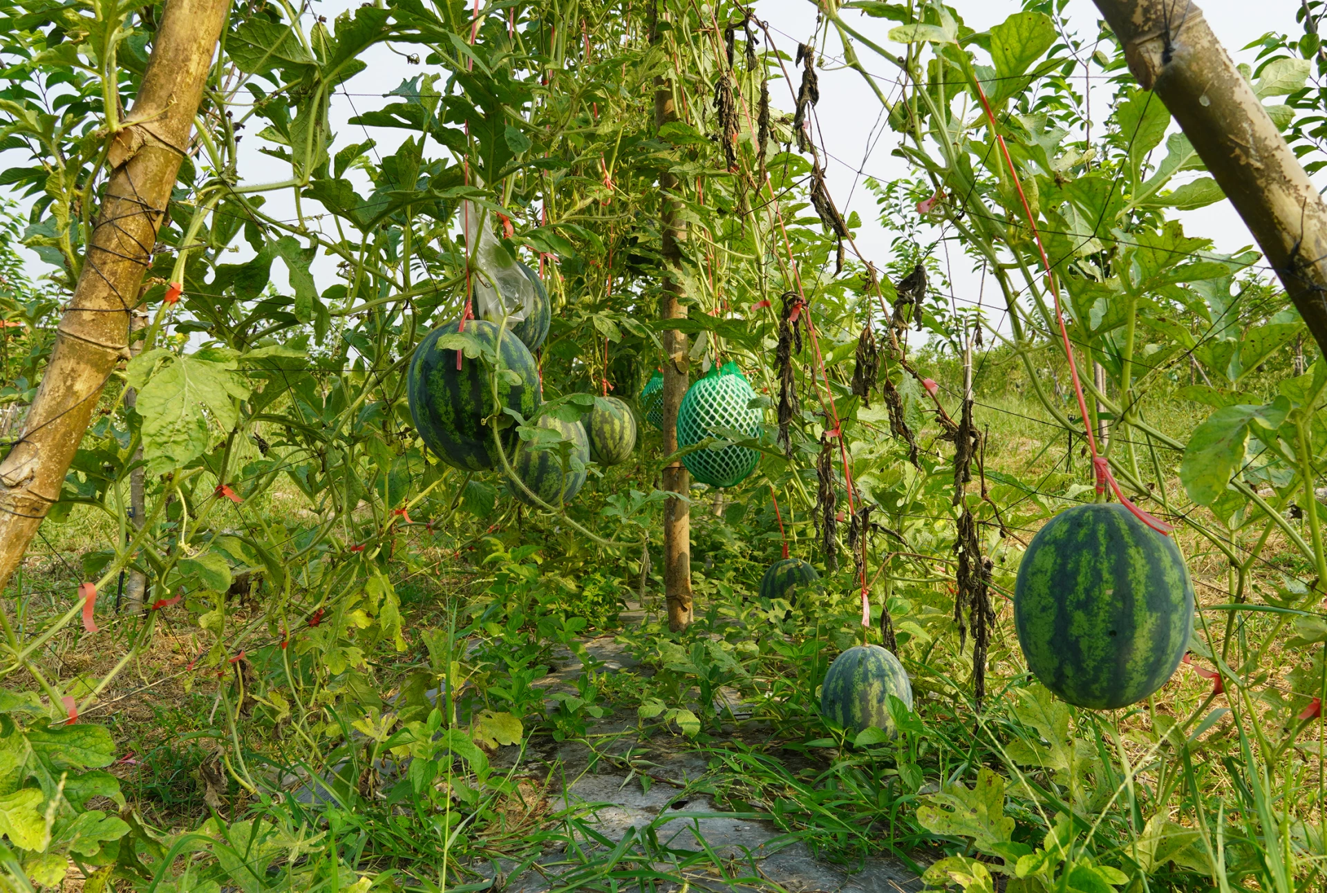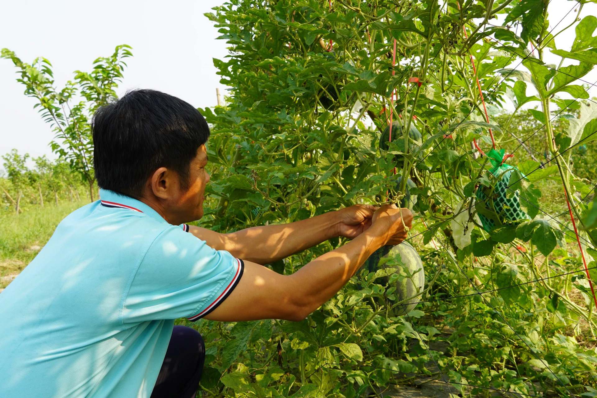 Việc trồng dưa hấu leo giàn đòi hỏi nhiều công chăm sóc - Ảnh: C.N